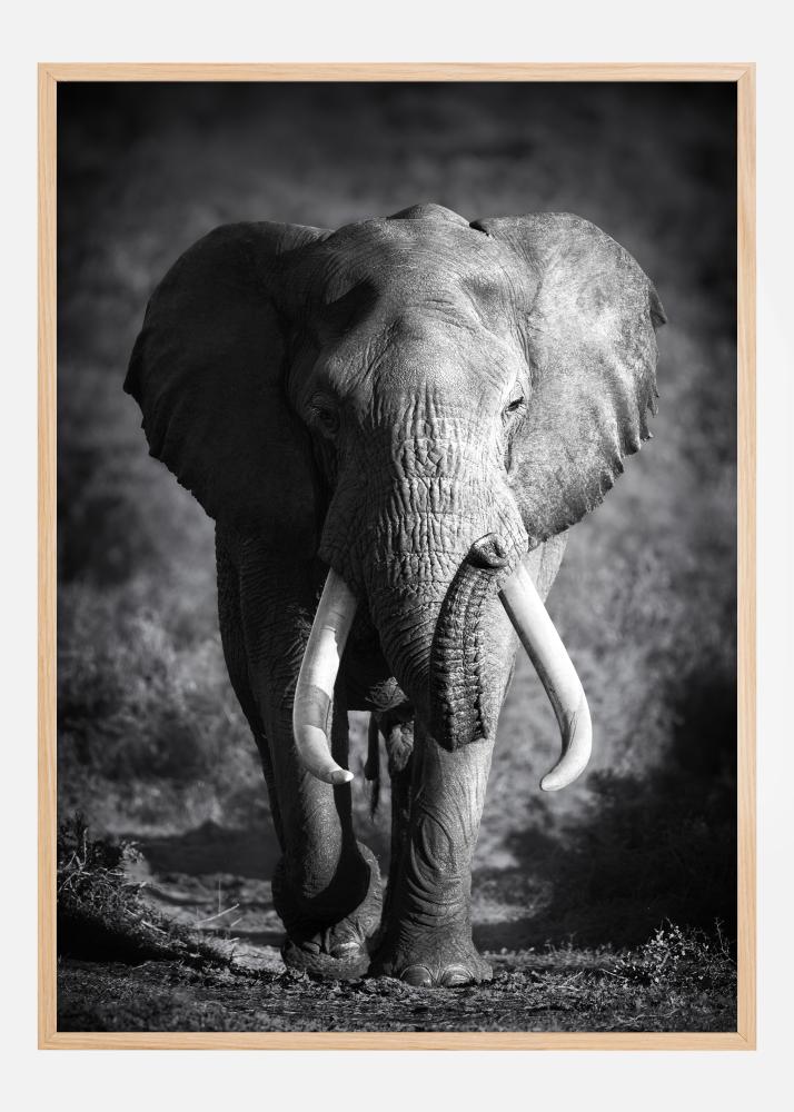 Această imprimare alb-negru nu este doar o ilustrare a celui mai mare animal terestru din lume, ci și un omagiu adus măreției lumii naturale. Contrastul dintre texturile dramatice ale elefantului și fundalul moale face ca această afișă să devină ușor un punct de atracție în orice cameră, fiind în același timp o amintire subtilă a vieții sălbatice fascinante a planetei noastre.