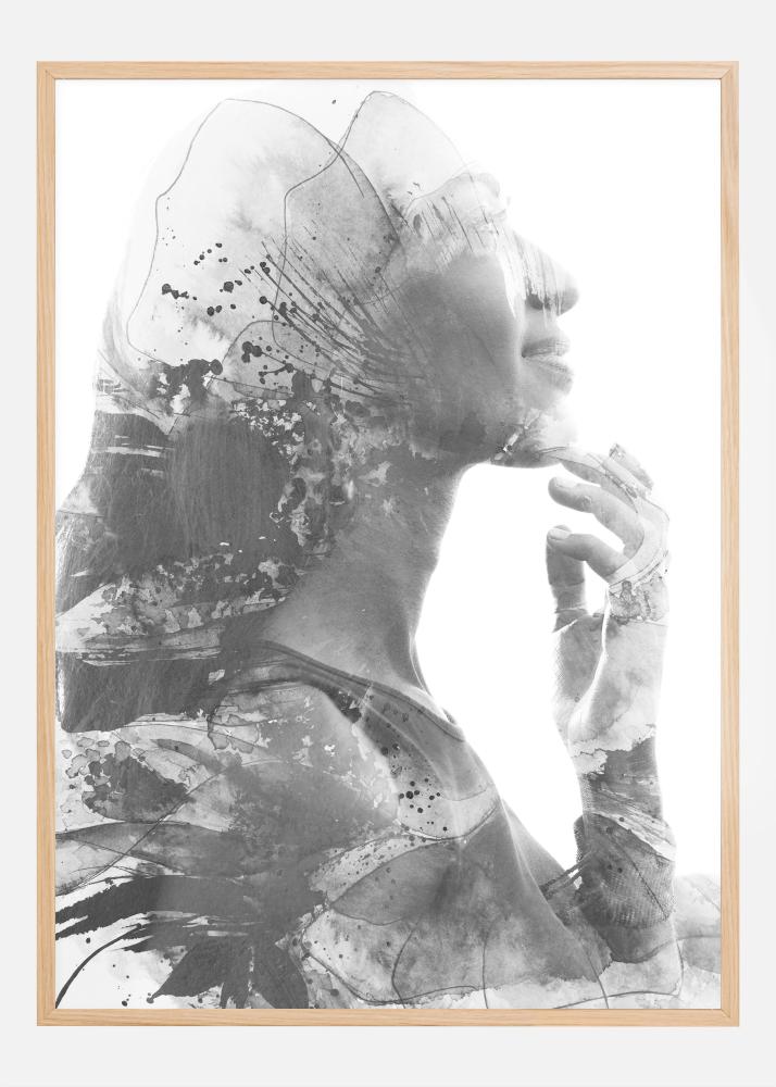 Această poster artistic prezintă o imagine dublu expusă a unei femei în profil, a cărei formă se îmbină cu stropi abstracți de cerneală și modele de acuarelă într-o paletă alb-negru. Imaginea este o fuziune captivantă de om și artă, care surprinde frumusețea reflecției feminine și natura efemeră a creativității. Această operă de artă ar fi un plus îndrăzneț și provocator într-un interior modern.