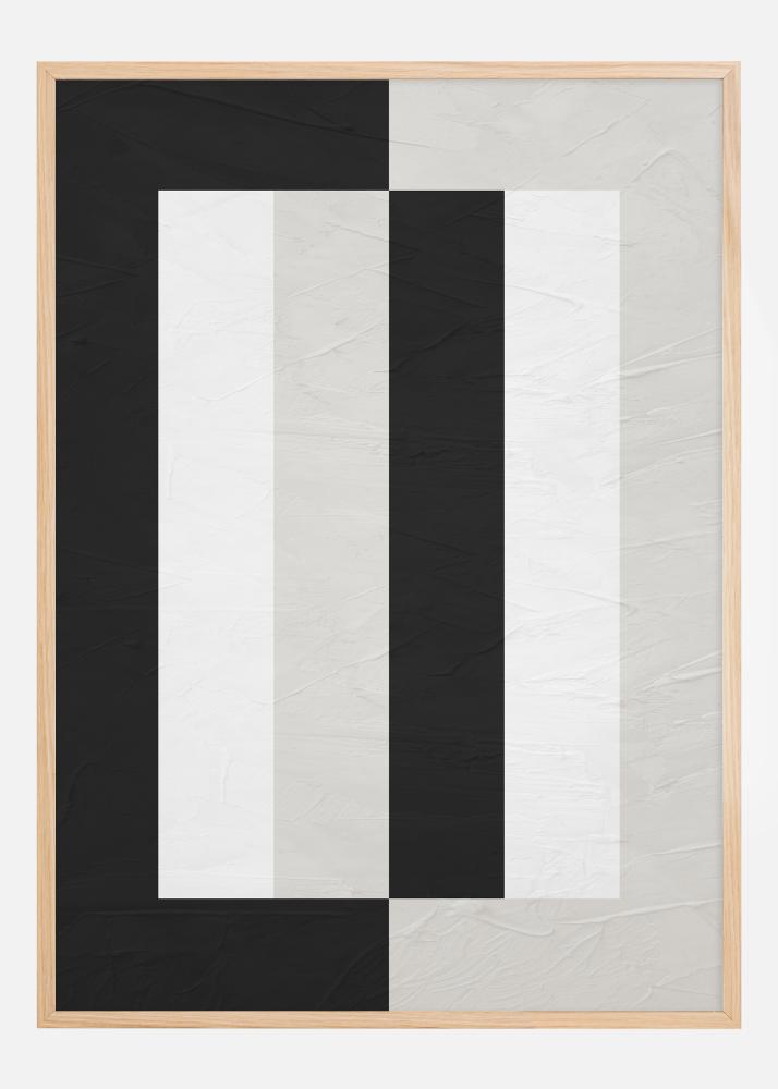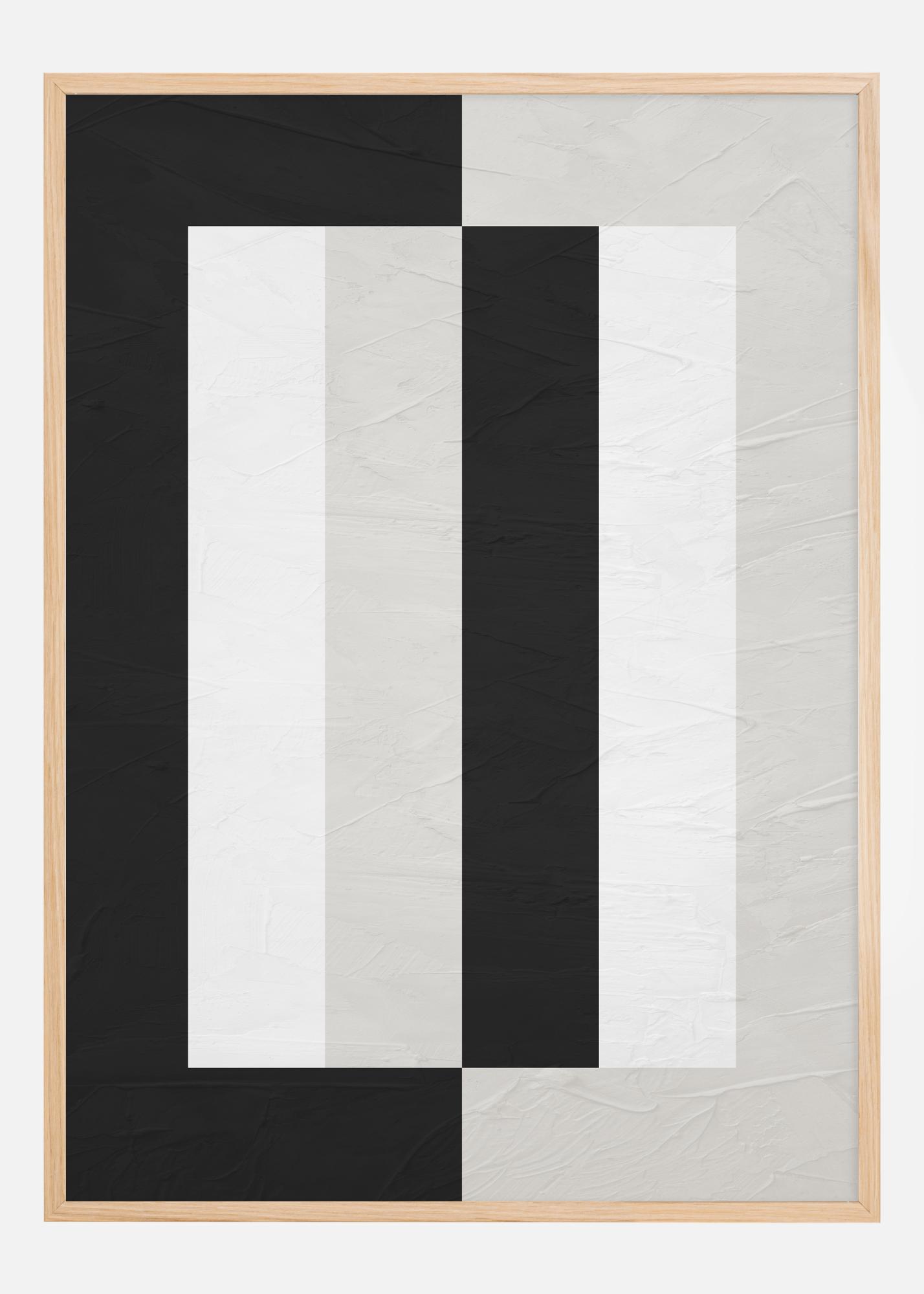 Această poster sofisticat prezintă o compoziție îndrăzneață și grafică care captează direct atenția privitorului. Combinația contrastantă de negru și alb formează o serie de linii și blocuri verticale, creând o iluzie optică de adâncime și mișcare. Acest afiș este ideal pentru amenajatorul modern care caută o operă de artă care să transmită un sentiment de eleganță și design contemporan. Paleta restrânsă de culori face ușor de integrat această imagine în diferite camere și medii.