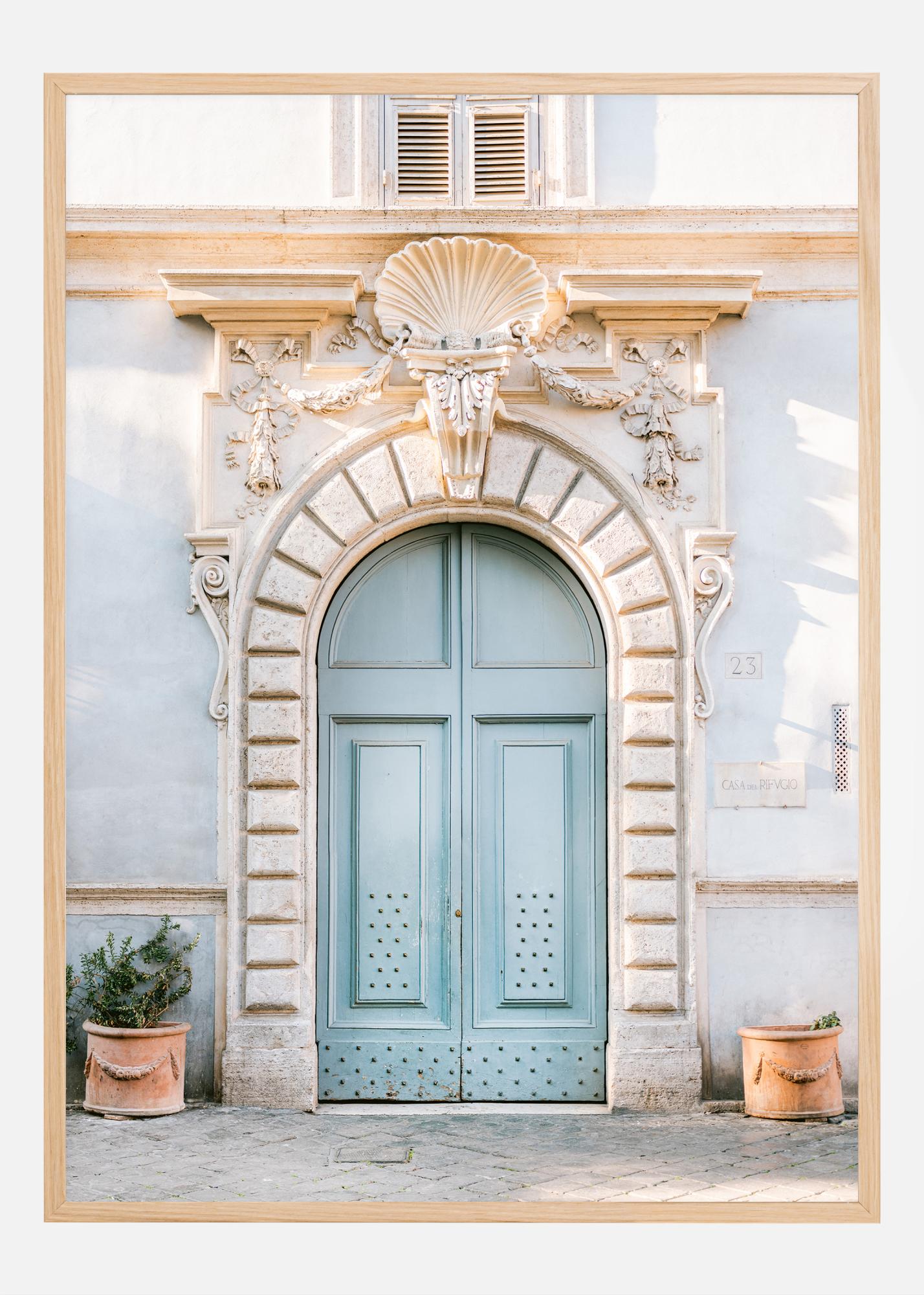 Acest poster capturează frumusețea și farmecul unei arhitecturi clasice europene. Ușa dublă albastru deschis este înconjurată de un portal elegant din piatră, cu detalii fin sculptate și ornamente care oferă un sentiment de bogăție istorică și patrimoniu cultural. Deasupra ușii se află un arc impresionant în formă de cochilie care completează această intrare impunătoare. Pe ambele părți ale ușii se găsesc ghivece cu plante verzi, care oferă un contrast natural și vibrant cu fațada din piatră. Această imagine emană o atmosferă liniștită și înălțătoare, perfectă pentru a adăuga un element de frumusețe clasică în orice casă.