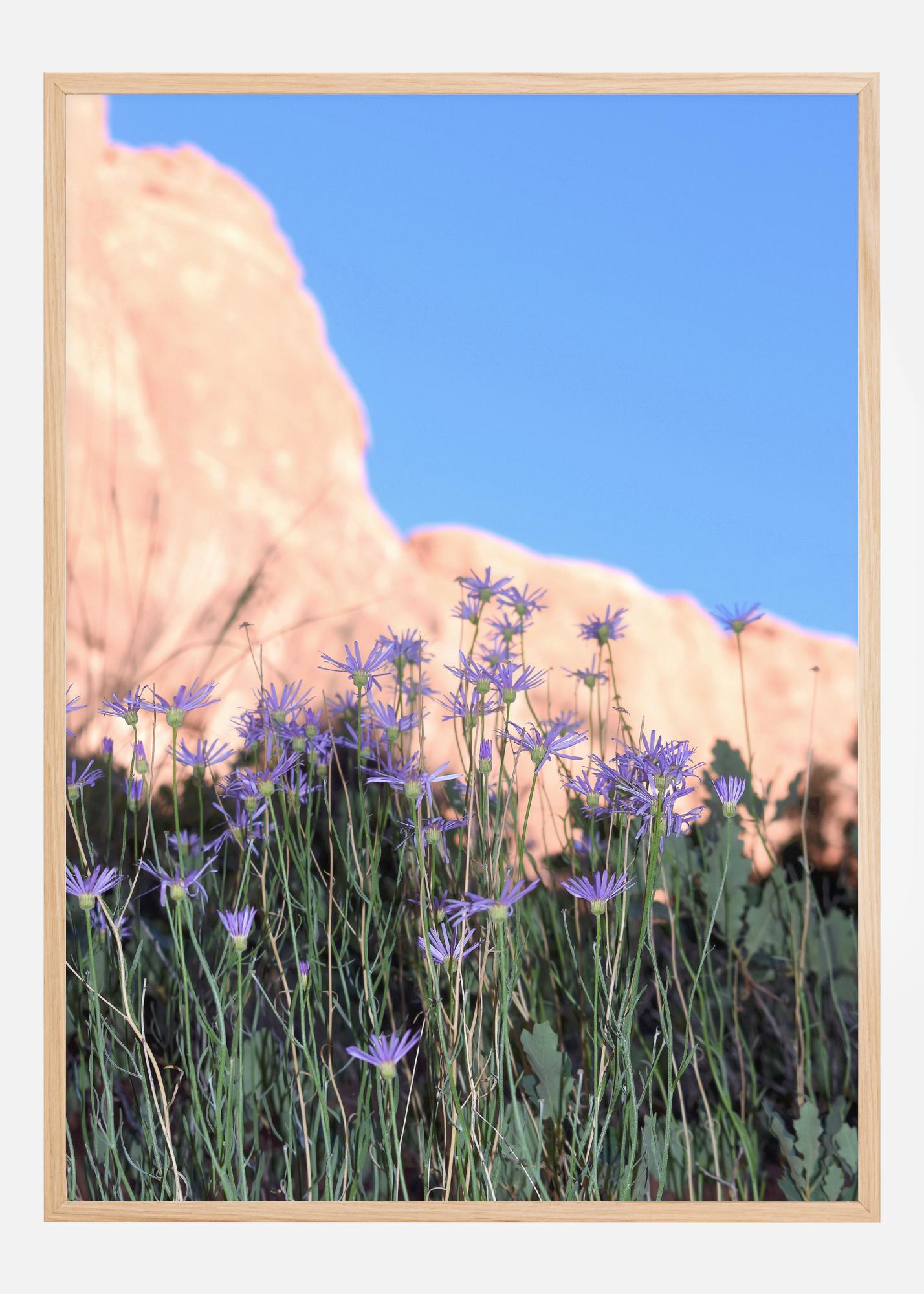 Un poster natural orbitor cu flori mov, munți stâncoși și un cer albastru puternic. Florile mov sunt în prim-plan și se îndreaptă spre cer, în timp ce muntele portocaliu constituie o limită pentru cerul vast și larg. Lasă-te pierdut în natură când aduci acasă această operă și o afișezi în dormitorul tău.