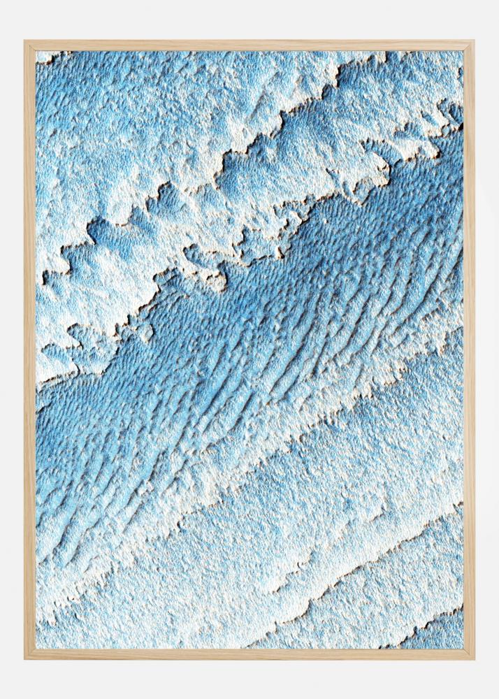 Un poster cu vedere aeriană cu valuri care lovesc țărmul. Linii albe spumoase în fiecare val în timp ce apa se încrețește și se apropie de pământ. Zonele de un albastru deschis și azuriu fac din aceasta o imagine îndrăzneață. Potriviți-o cu un perete portocaliu pentru a obține efectul complet prin aceste culori complementare.