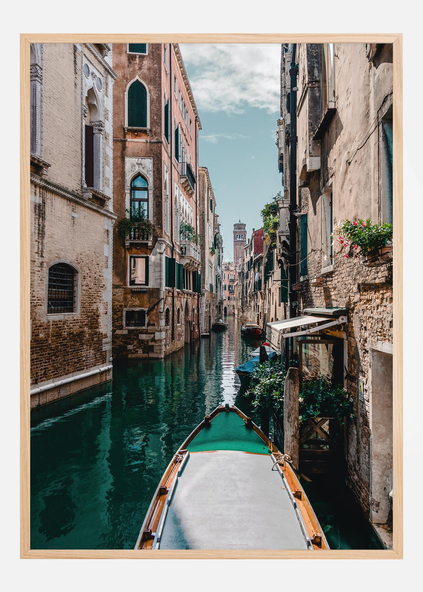Această poster captivant surprinde esența unui canal pitoresc din Veneția, complet cu o gondolă tradițională în prim-plan. Lumina cade frumos peste fațadele colorate ale clădirilor înconjurătoare, iar reflecțiile din apa liniștită creează o oglindire clară și fermecătoare. Nuantele de roșu pământiu și tonurile portocalii ale zidăriei clădirilor sunt contrastate de albastrul verzui liniștit al canalului.