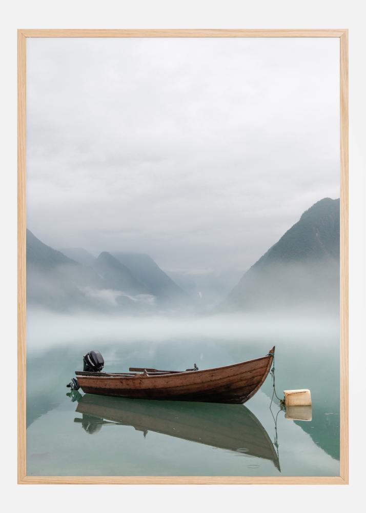 Un poster elegant cu o barcă în mijlocul unui lac învăluit în ceață. O barcă maro apare în detalii clare în prim-plan, cu o reflecție ascuțită în apă. În fundal, învăluite în ceață, se află munți moi care se ridică din apă. Aduceți liniștea unui peisaj deschis în casa dumneavoastră.