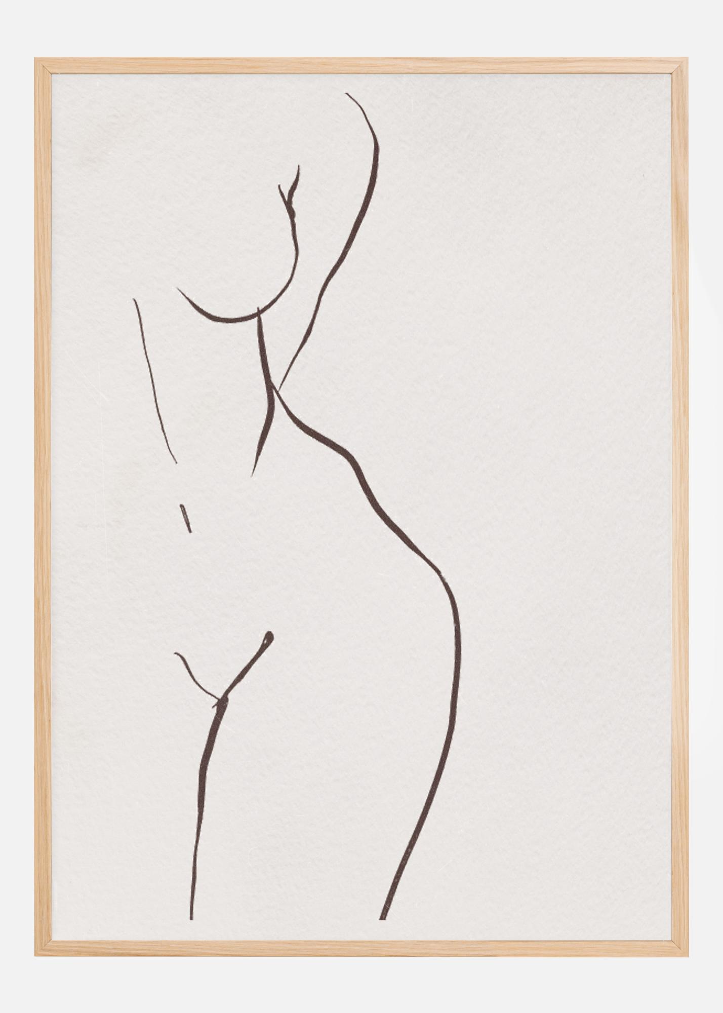 Un poster cu șoldurile unei femei. Linii negre puternic conturate pe un fundal alb schițează partea laterală a unei femei de la șold până la umăr. Curbe moi conduc privirea în jurul formelor sale în această imagine fluidă. Pune-l pe peretele tău pentru o senzație artistică.