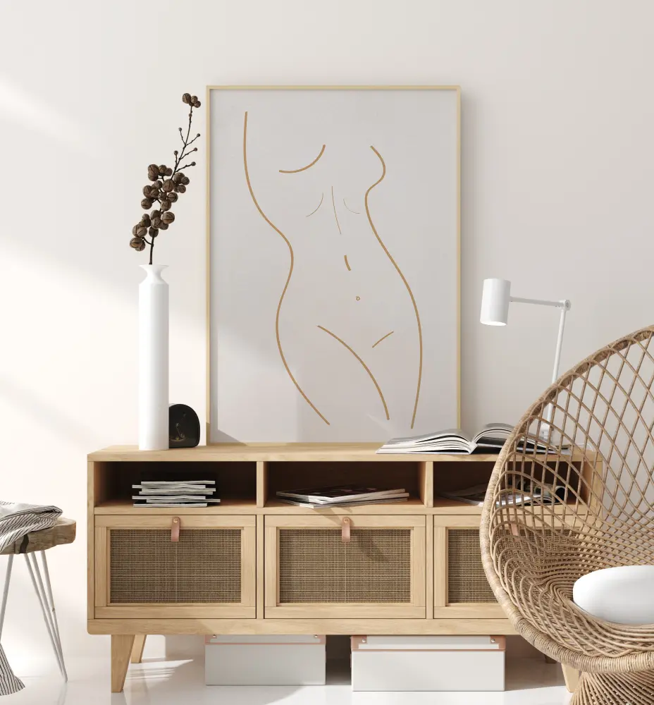 Un poster cu o femeie în linii maronii. Linii maronii puternice și îndrăznețe schițează picioarele, abdomenul și pieptul femeii. Liniile sunt uniforme și ascendente în acest desen elegant. Agățați această lucrare pe un perete simplu alb pentru o atmosferă de galerie.