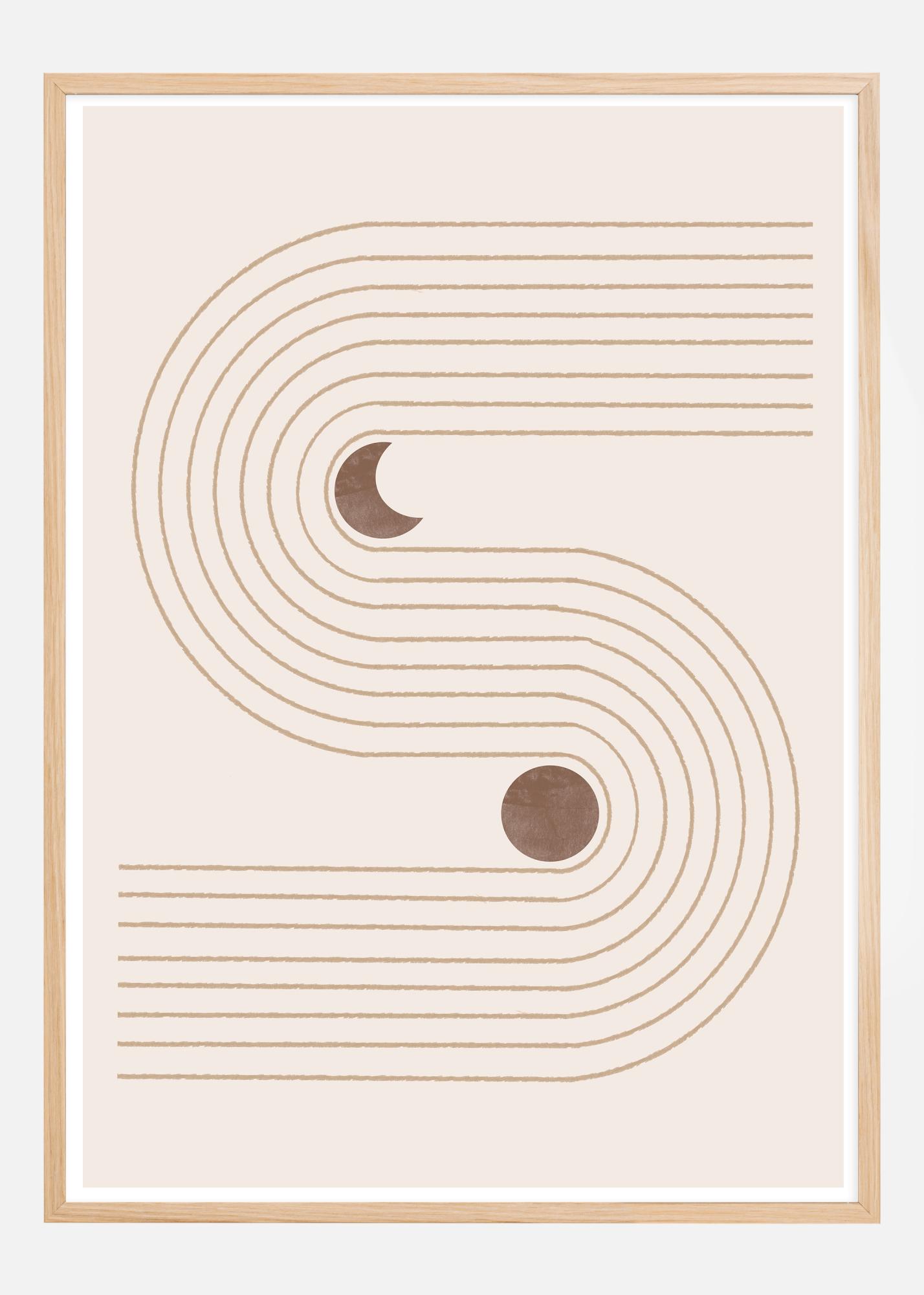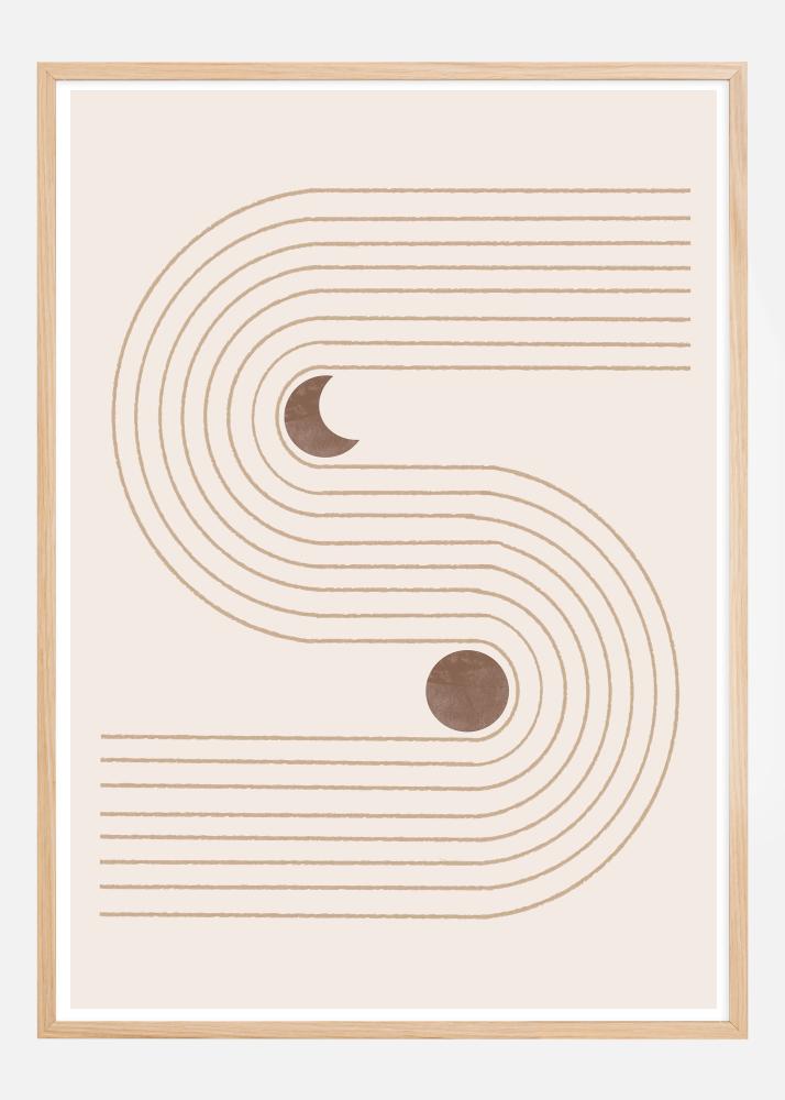 Afișul acesta oferă o interpretare minimalistă a formelor boeme și a corpurilor cerești, cu arcurile și liniile sale învolburate formând un model armonios. Are o paletă calmantă de nuanțe pământii, cu accente de cercuri maro închis care pot reprezenta luni sau planete, oferind designului o notă cosmică. Arcurile oferă o senzație de mișcare și fluiditate, în timp ce formele rotunde aduc un element de echilibru și simetrie.