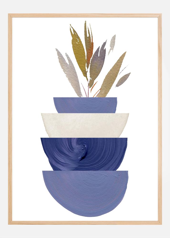 Din centrul bolului superior se ridică forme abstracte care amintesc de frunze sau pene, pictate în culori naturale precum verde măsliniu, brun ruginiu, gri și bej. Formele organice împreună cu bolurile geometrice creează un contrast unic care este atât plăcut ochiului, cât și incitant pentru gândire. Această imprimare combină elemente de natură și design într-un mod care captează esența unui stil boem modern, cu o paletă de culori care conține atât tonuri naturale, cât și nuanțe reci de albastru. Posterul oferă un detaliu elegant și stilat pentru orice cameră, fie că este vorba de un living, dormitor sau birou.
