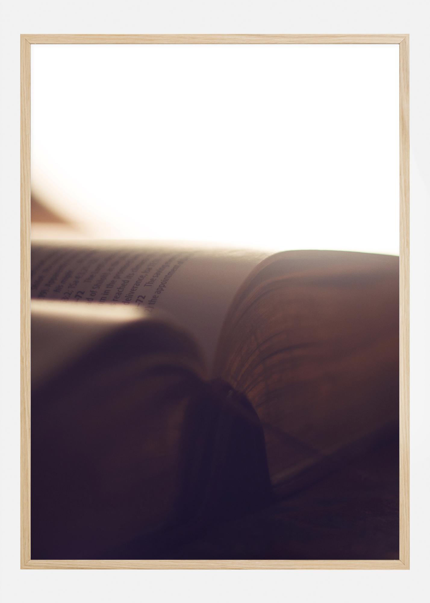 Un poster cu o carte deschisă văzută de aproape. Lumina albă umple cea mai mare parte a acestei imagini, deoarece luminează cartea cu marginile aurite ale paginilor. Cuvintele sunt cu greu vizibile, ceea ce face ca acesta să fie printul perfect pentru o cameră de studiu.