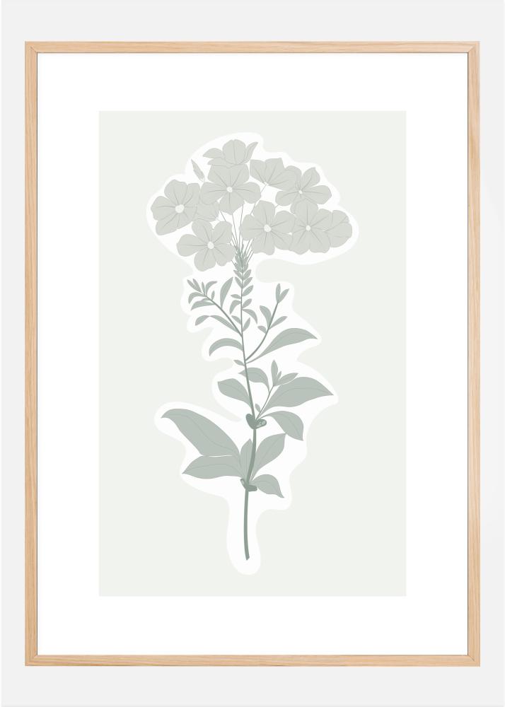 Un poster cu un imprimeu botanic simplu al unei flori și ale frunzelor sale. Culorile gri-verzi moi constituie această tulpină simplă, dar totuși elegantă, cu flori. Înrămat în alb și gri, acest imprimeu trezește la viață amintiri ale ilustrațiilor botanice de modă veche. Expune o bucată din grădina ta cu ajutorul acestui imprimeu fermecător.