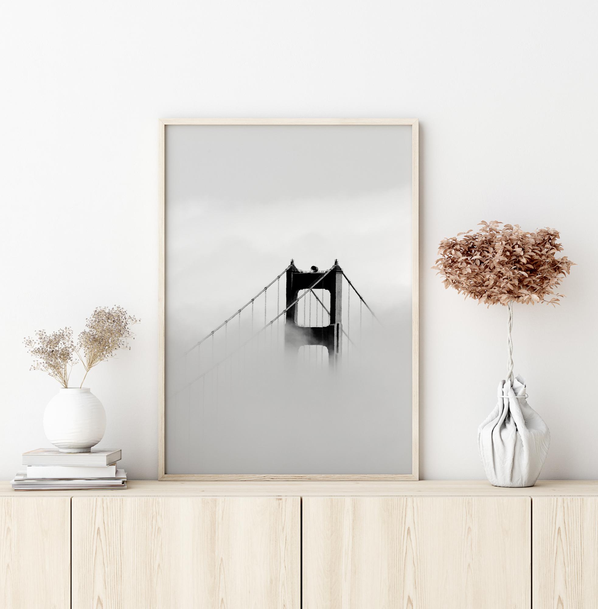 Un poster dramatic cu vârful unui pod. Ceața se ridică și acoperă întregul pod, cu excepția vârfului. Negru și solid, podul se ridică între cerul înnorat de deasupra și ceața de dedesubt. Bucură-te de această imagine uimitoare atunci când ai acest poster pe perete.