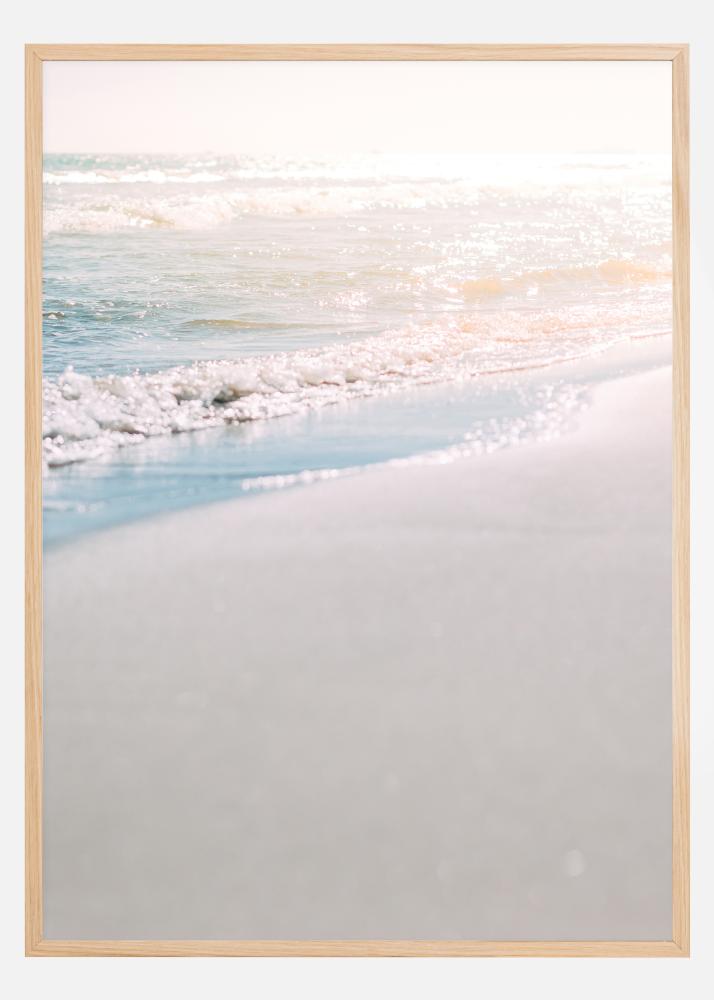 Un poster cu prim-plan al valurilor care se izbesc de plaja de nisip neted, în timp ce o lumină albă strălucește pe suprafața apei, adăugând o senzație magică într-o dimineață devreme. Nuanțele moi de albastru, roz și galben fac din această operă un adaos perfect pentru dormitor.