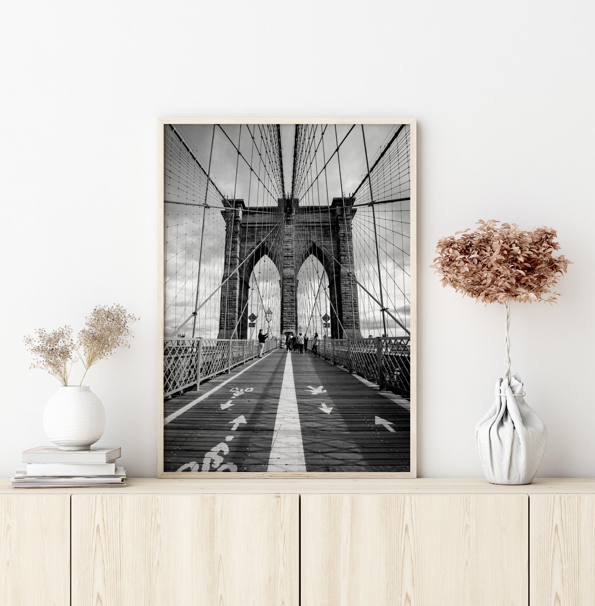 O fotografie alb-negru a trotuarului de pe Brooklyn Bridge, turnuri impunătoare și un dispozitiv interesant de suspendare sub formă de cabluri de oțel în rețele mari. Un poster care se potrivește excelent în combinație cu alte favorite într-un colaj mai mare.