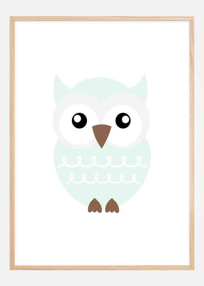 Poster drăguț cu pasărea la modă numărul unu, bufnița. Ilustrația unei bufnițe stilizate de culoare albastru-gheață pe un fundal alb a devenit un clasic modern. Motivul se potrivește la fel de bine în sufragerie cât și în camera copilului și arată deosebit de bine într-un decor care preia culoarea din tablou. Combină cu alte păsări sau animale pentru o senzație sălbatică.