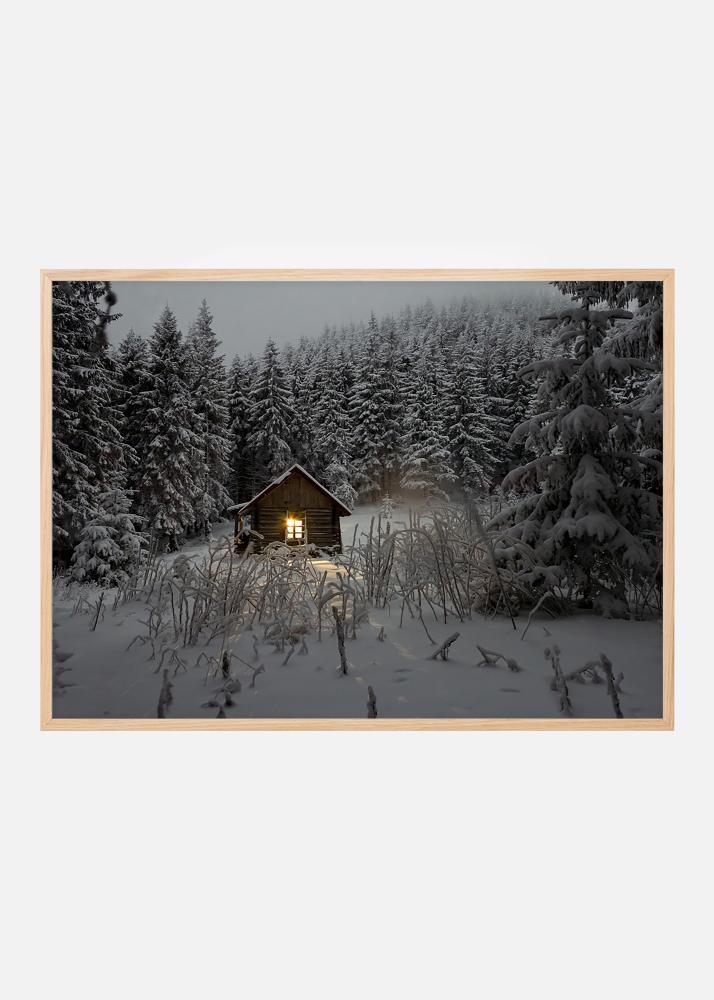 Poster cu o căsuță drăguță din lemn înveșmântată de iarnă, adânc în interiorul pădurii de brazi. Lumina de la fereastră care luminează în noaptea înghețată de iarnă conferă fotografiei o adâncime și face tabloul interesant. Imaginea se potrivește tuturor stilurilor de design interior și mediilor. Este la fel de frumoasă într-o ramă subțire din metal negru ca și într-o variantă mai robustă din lemn, sau de ce nu să scoți în evidență lumina din imagine într-o ramă clasică aurie.