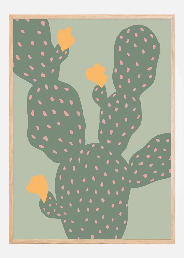 Această posteră jucăușă și fermecătoare prezintă o imagine stilizată a unui cactus cu accente luminoase. Cu fundalul său verde moale și figurile de cactus verzi punctate cu pete roz și flori galbene, imaginea oferă o senzație proaspătă și plină de bucurie. Acest print combină jucăușenia cu o estetică de design modern, și ar fi o decorațiune minunată de perete într-o cameră de copii, o bucătărie luminoasă sau un spațiu de lucru creativ care necesită o doză de umor și culoare inspirat din natură.