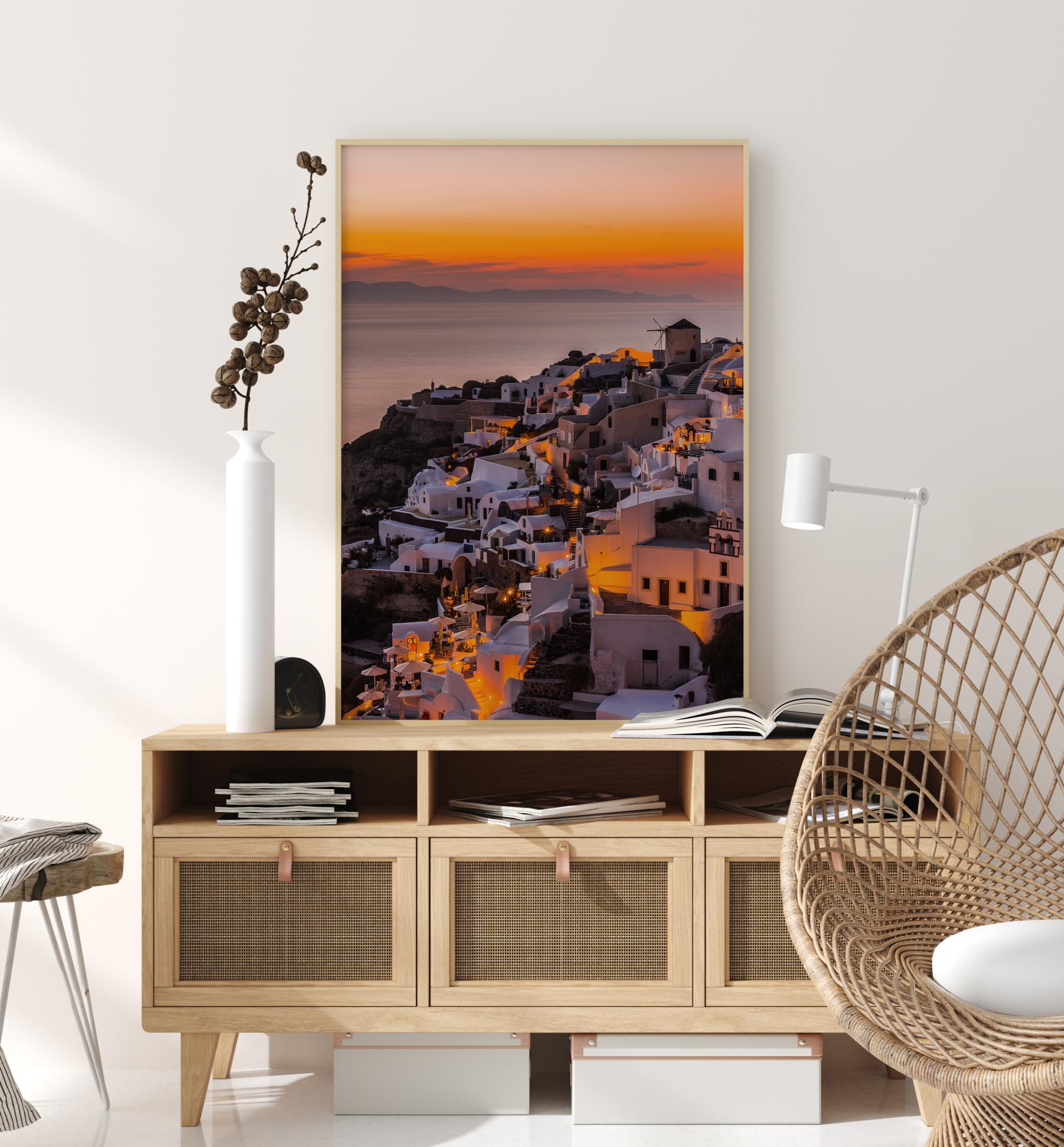 Un poster scenic cu Calisera Santorini la apus. Micul oraș strălucește ușor în luminile stradale. Casele albe se evidențiază cu marea moale și cețoasă și munții în fundal, cu cerul viu la apus. Călătoriți fără să părăsiți casa în timp ce priviți acest poster.