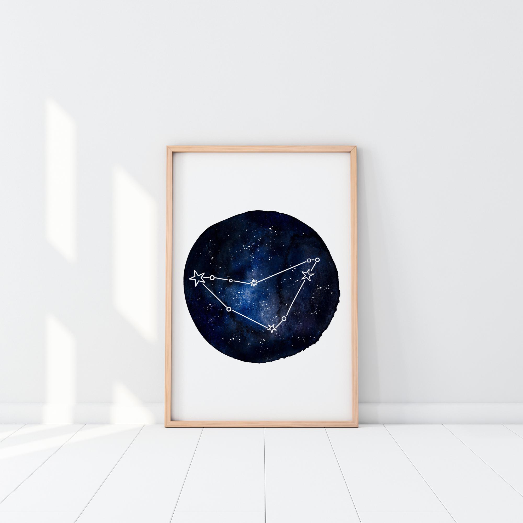 Un poster cu horoscopul Capricornului. Un cerc albastru închis umple mijlocul unui fundal alb. În cerc sunt diferite nuanțe de albastru, precum și stele. Constellatia principală este semnul zodiacal al Capricornului. Atârnă acest poster dacă îți place semnul tău zodiacal.