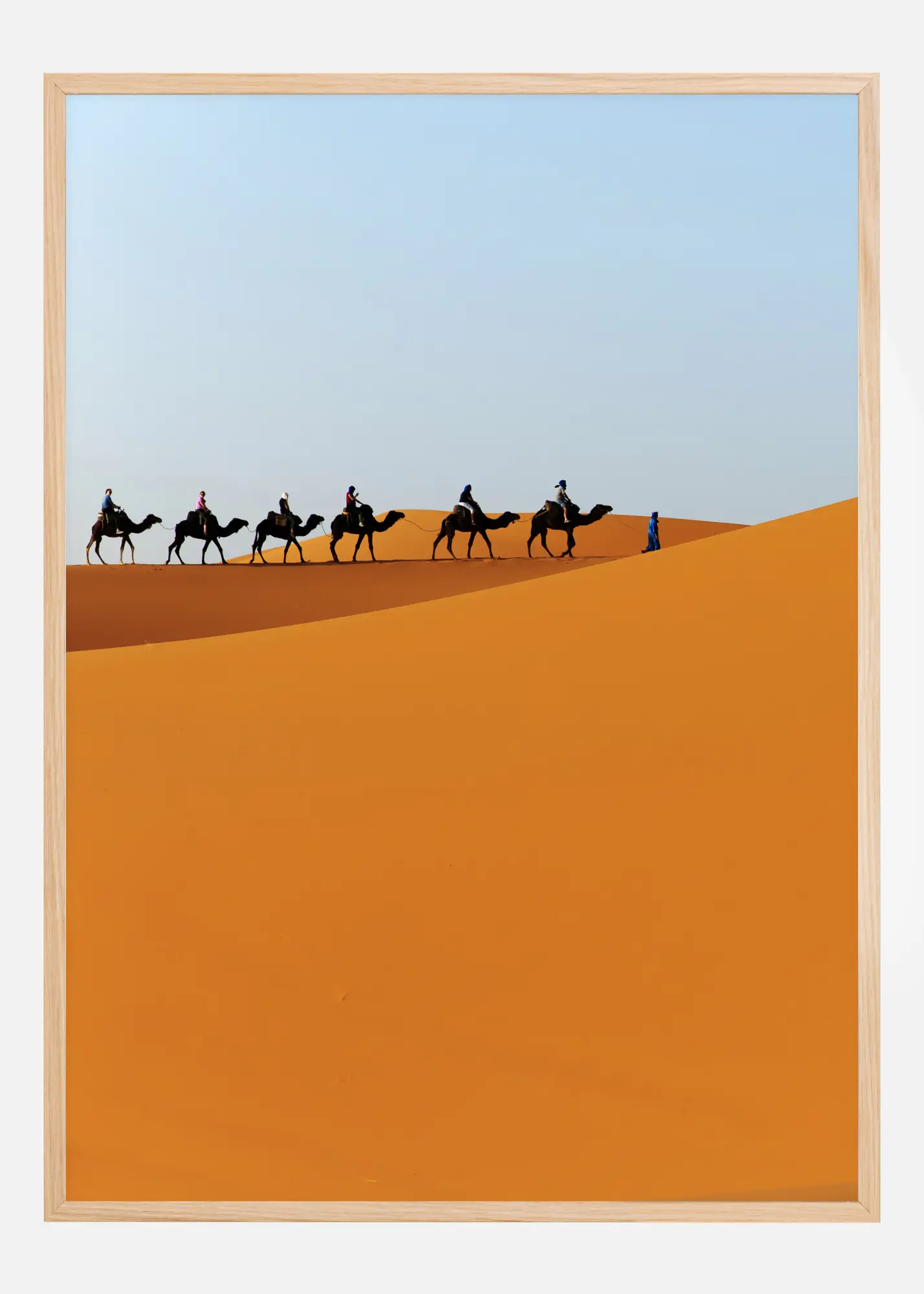 Un poster stilizat cu o caravană de cămile care traversează deșertul. Secțiuni mari și îndrăznețe de culoare portocalie atrag privirea către linia siluetei celor șase cămile și călăreții lor care traversează deșertul. Bucurați-vă de culorile în care un deșert portocaliu și un cer albastru se întâlnesc cu culori complementare.