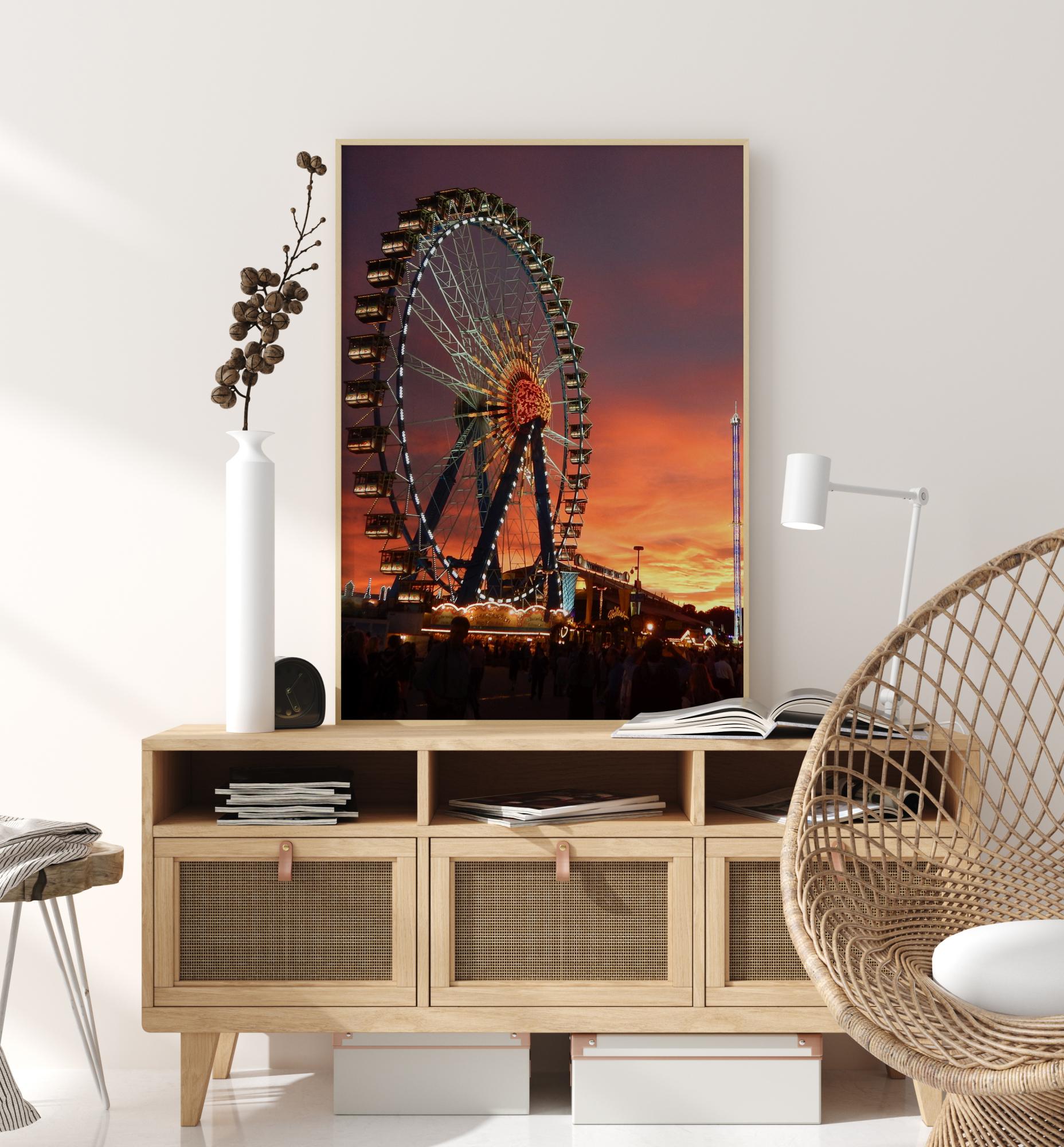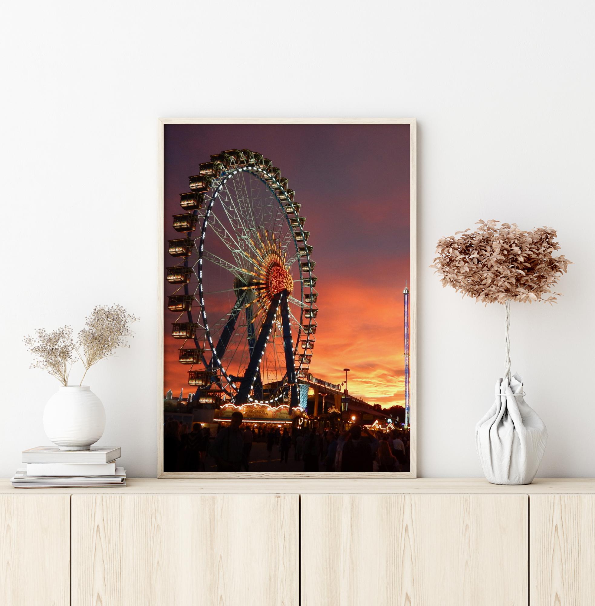 Un poster fantastic cu un carusel în noapte. În stânga se află roata, luminând cu o strălucire incandescentă. Dedesubt, mulțimi de oameni privesc roata în timp ce soarele apune către un cer de noapte uimitor, portocaliu și violet. Adu puțin dramatism nocturn pe pereții tăi cu ajutorul acestui poster.