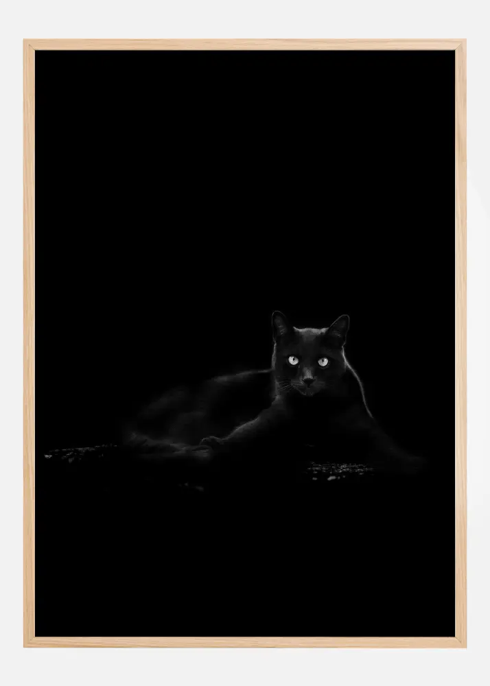 Un poster care arată o pisică neagră pe un fundal negru. Acest imprimeu misterios necesită să te uiți o dată în plus deoarece pisica neagră este aproape invizibilă pe fundal. Doar ochii și o blană ușor iluminată subtil fac ca pisica să fie vizibilă în imagine. Această imagine creează o impresie uimitoare într-un hol întunecat.