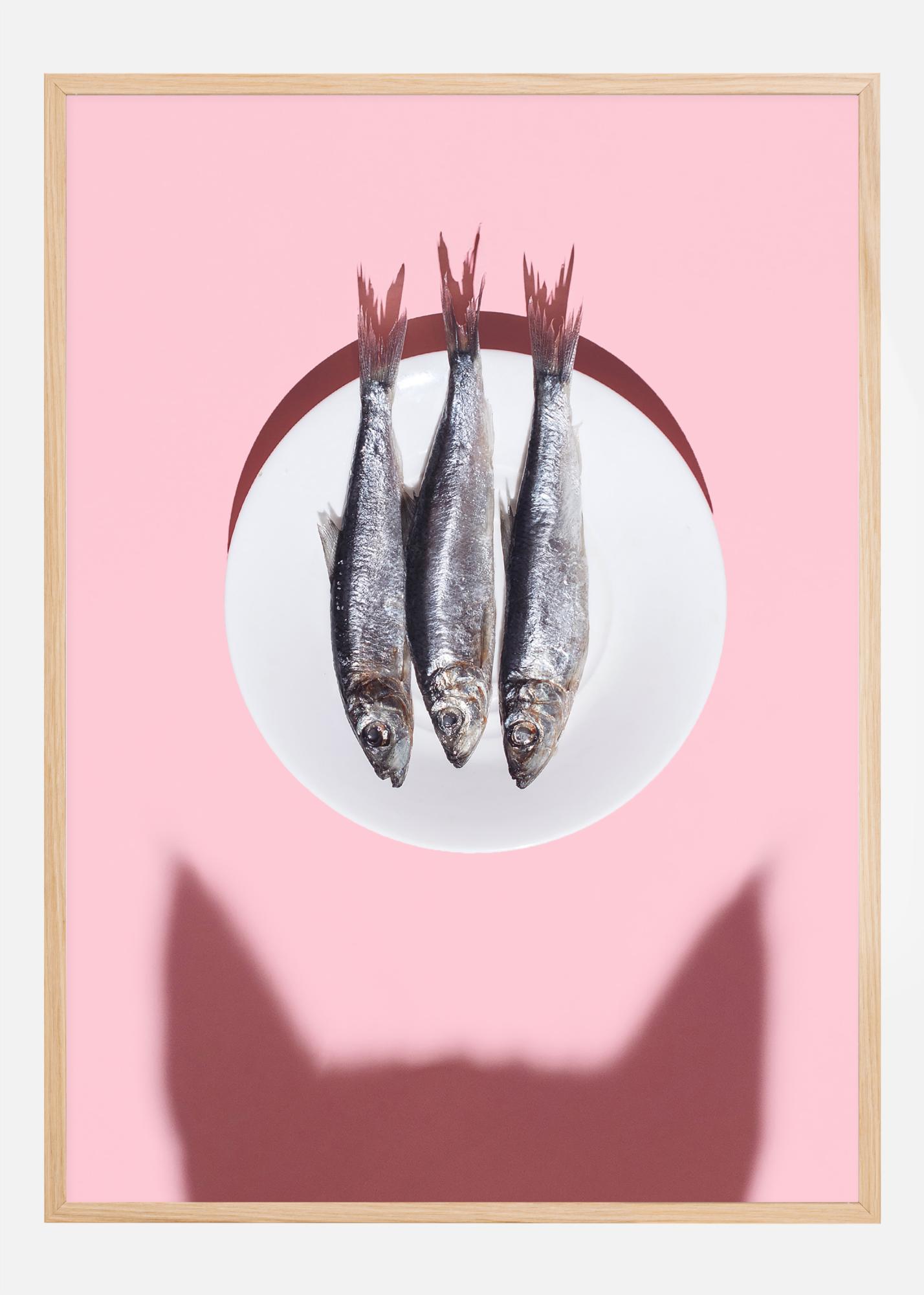 Această poster artistic înfățișează un trio de pești strălucitori odihnindu-se pe o farfurie albă curată, oferind un contrast clar față de fundalul roz moale. Estetica sa minimalistă îl face un adaos atrăgător în orice casă modernă. Jocul dintre albul pur și rozul liniștitor creează o imagine care este la fel de mult o natură statică, cât și un ornament de design sofisticat. Silueta inconfundabilă a unei pisici, creată de lumină și umbră, adaugă un unghi jucăuș și creativ motivului, asigurând că acest poster va deveni un punct de discuție.