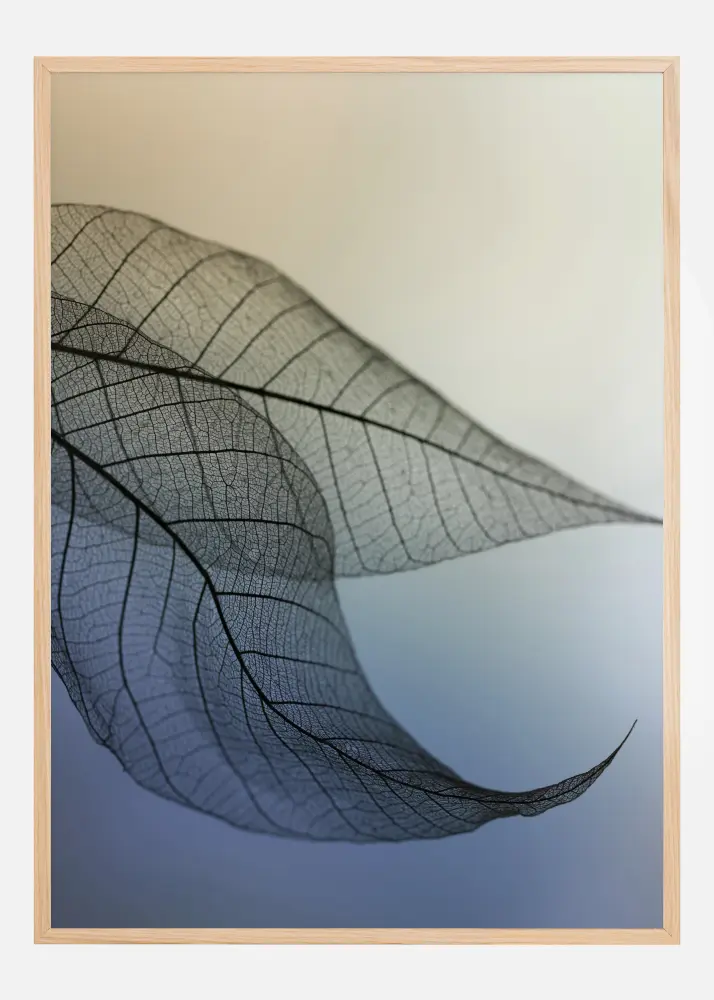Un poster elegant cu un prim-plan al două frunze. Tonurile albastre moi se estompează într-un fundal ușor de culoarea piersicii în acest poster. Două frunze transparente în prim-plan umplu imaginea în stânga, oferind un efect magic. Această imagine oferă casei tale o senzație de eleganță.
