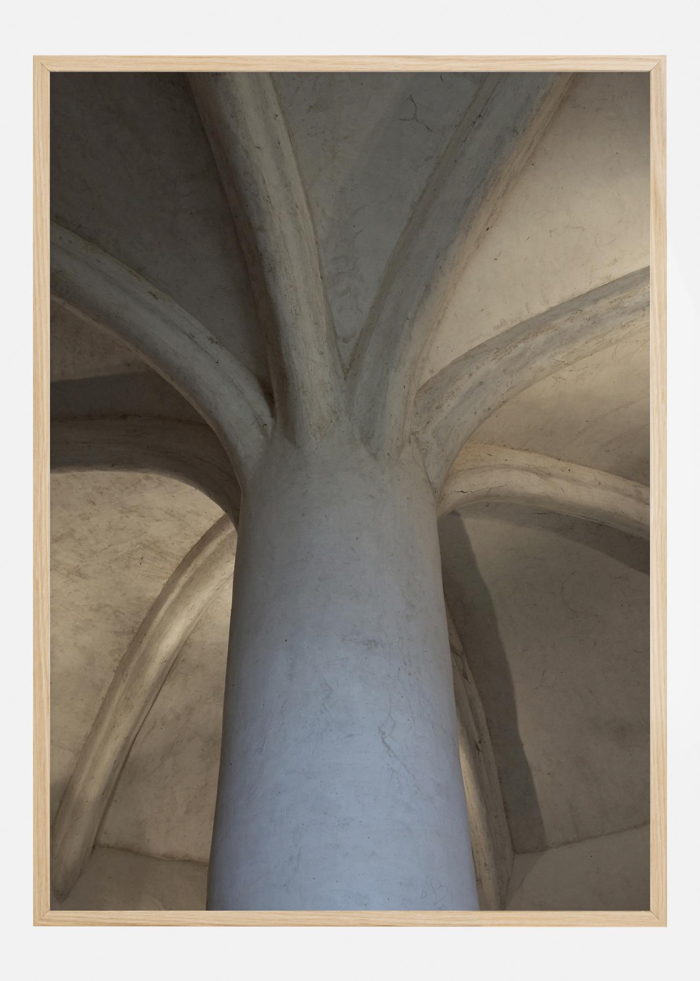 Un poster arhitectonic cu interiorul unei capele sau al unui tavan de biserică. O singură coloană stă în mijloc și atinge tavanul unde opt arcade se răspândesc ca o floare. Piatră rece creează un sentiment de măreție de care te poți bucura de acasă.