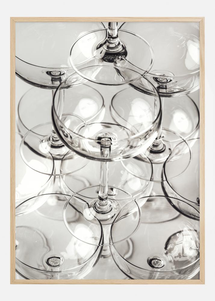 Această afiș elegant și sofisticat surprinde frumusețea și claritatea unei cascade de cupe de șampanie. Imaginea descrie un prim-plan al structurii ingenioase a sticlei, unde lumina se reflectă și se refractă prin materialul transparent, creând un dans de lumini și umbre. Bogăția detaliilor și precizia delicată a compoziției subliniază formele delicate ale paharelor și nuanțele subtile ale sticlei.