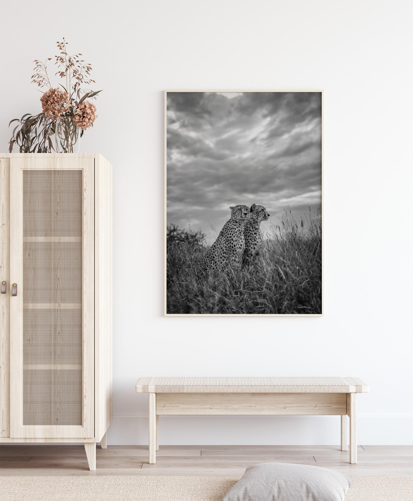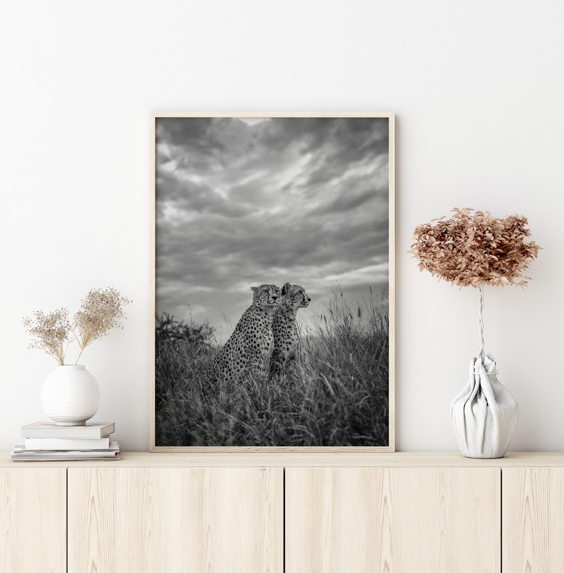 Un poster natural cu doi gheparzi care privesc peste câmpiile africane. Cerul înnorat contrastează cu petele fantastice ale acestor animale. Cu acest poster, poți aduce acasă măreția naturii.