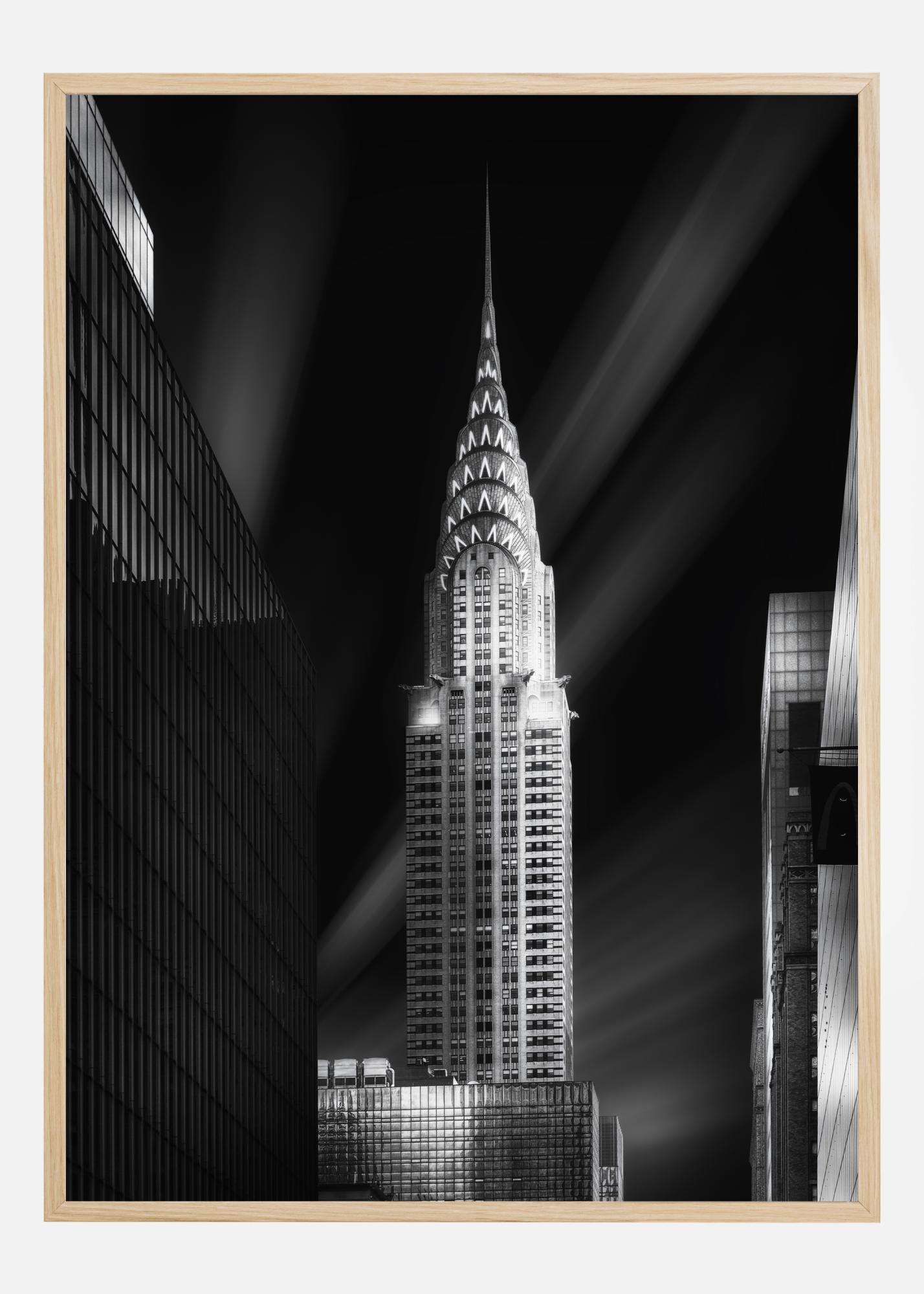 Un poster de noapte cu clădirea iluminată Chrysler din New York. Clădirea se află pe un cer negru în mijlocul fotografiei. Razele de lumină albă pe cer creează unghiuri și dramă. Faceți o declarație îndrăzneață cu această fotografie dramatică în alb și negru.
