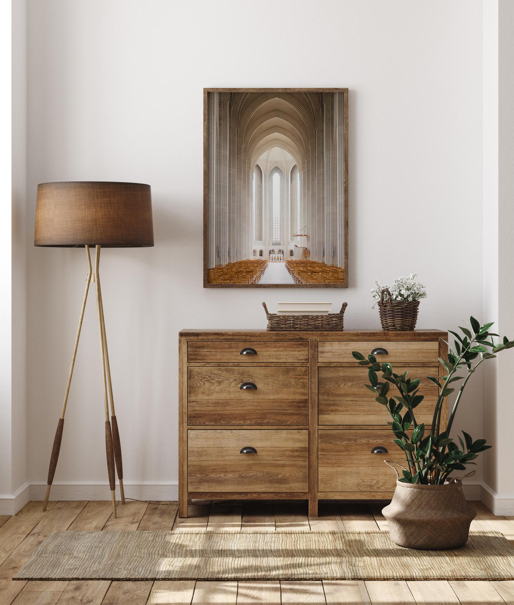 Un poster romantic al interiorului unei biserici. Scaune maro deschis delimitează culoarul în rânduri lungi pe fiecare parte. Arcurile gotice încadrează lucrarea, conducând privirea spre lumina albă luminoasă de la capătul coridorului bisericii. Mergi la biserică de acasă când ai acest poster religios atârnat acasă.
