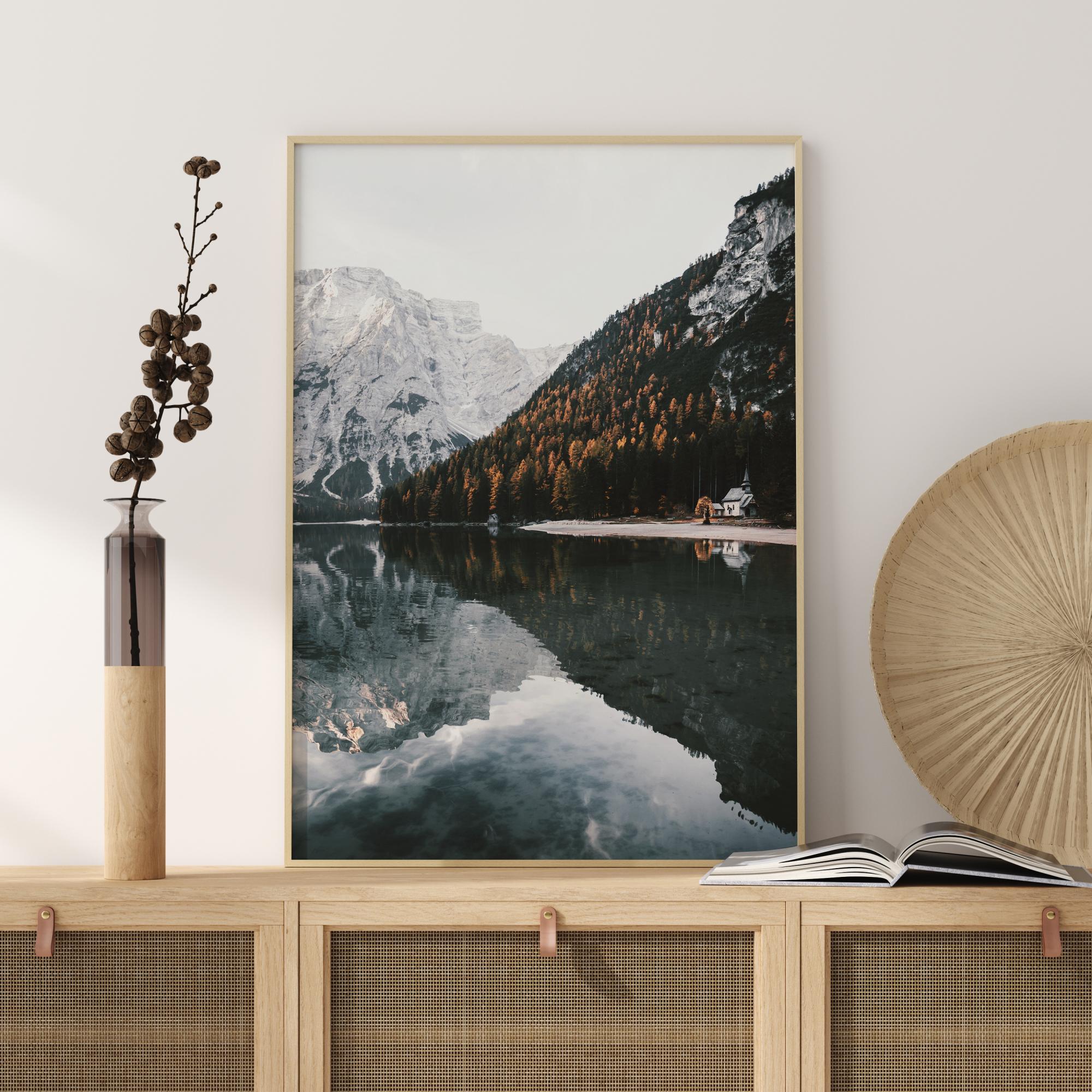 Un poster epic cu un peisaj montan cu o mică biserică situată în pădure. Bucură-te de măreția acestui peisaj înzăpezit unde munții se reflectă în lacul liniștit. Copacii aurii de toamnă mărginesc munții și o mică biserică albă stă la poale. Fii inspirat când privești minunile naturii.