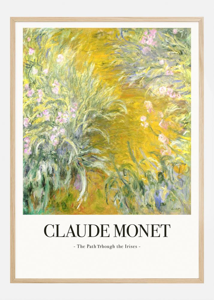 Titlul posterului, 'Calea prin irisi', ne introduce în viziunea lui Claude Monet asupra grădinii sale, un loc care i-a oferit inspirație nesfârșită. Această pictură, care abundă în tonuri vii de galben și verde, completate de irișii caracteristici, mov și roz, captează privirea spectatorului și invită la o plimbare de-a lungul căii invizibile. Semnătura lui Monet este plasată discret în colț, ceea ce accentuează autenticitatea operei de artă și importanța sa istorică.