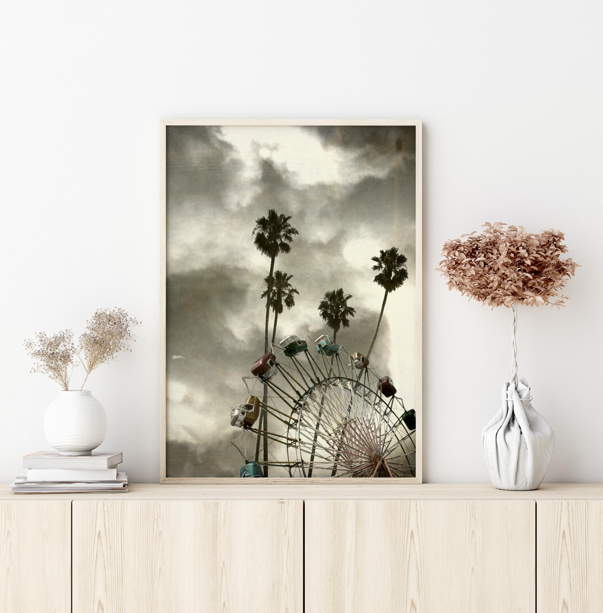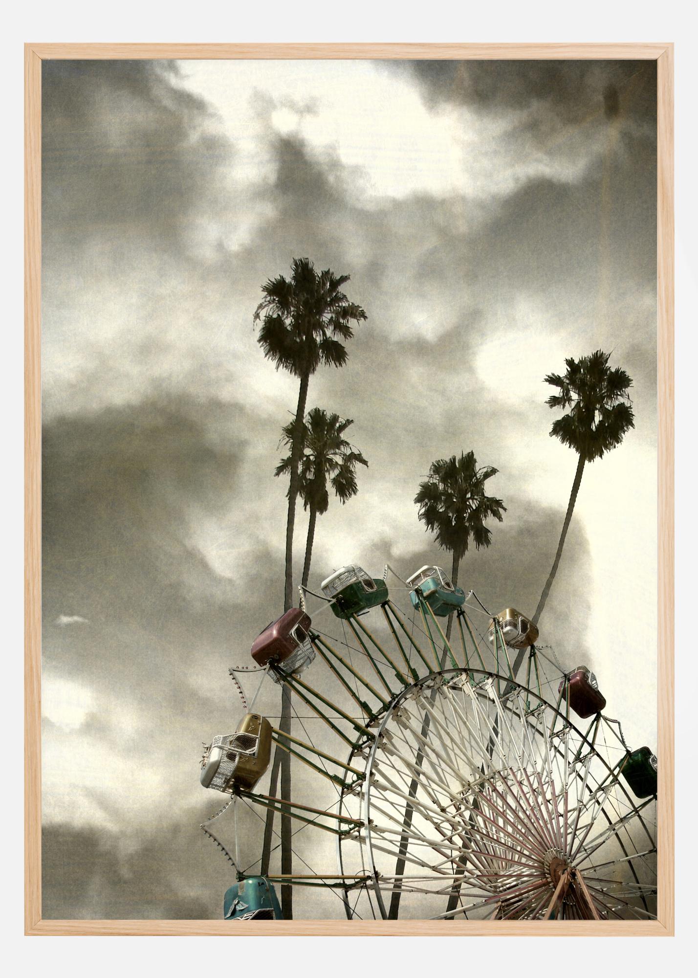 Un poster fotografic al unui carusel asemănător unei roți pariziene cu vagoane în pasteluri încântătoare pe un fundal de palmieri și un cer dramatic. Un poster frumos cu multă emoție.