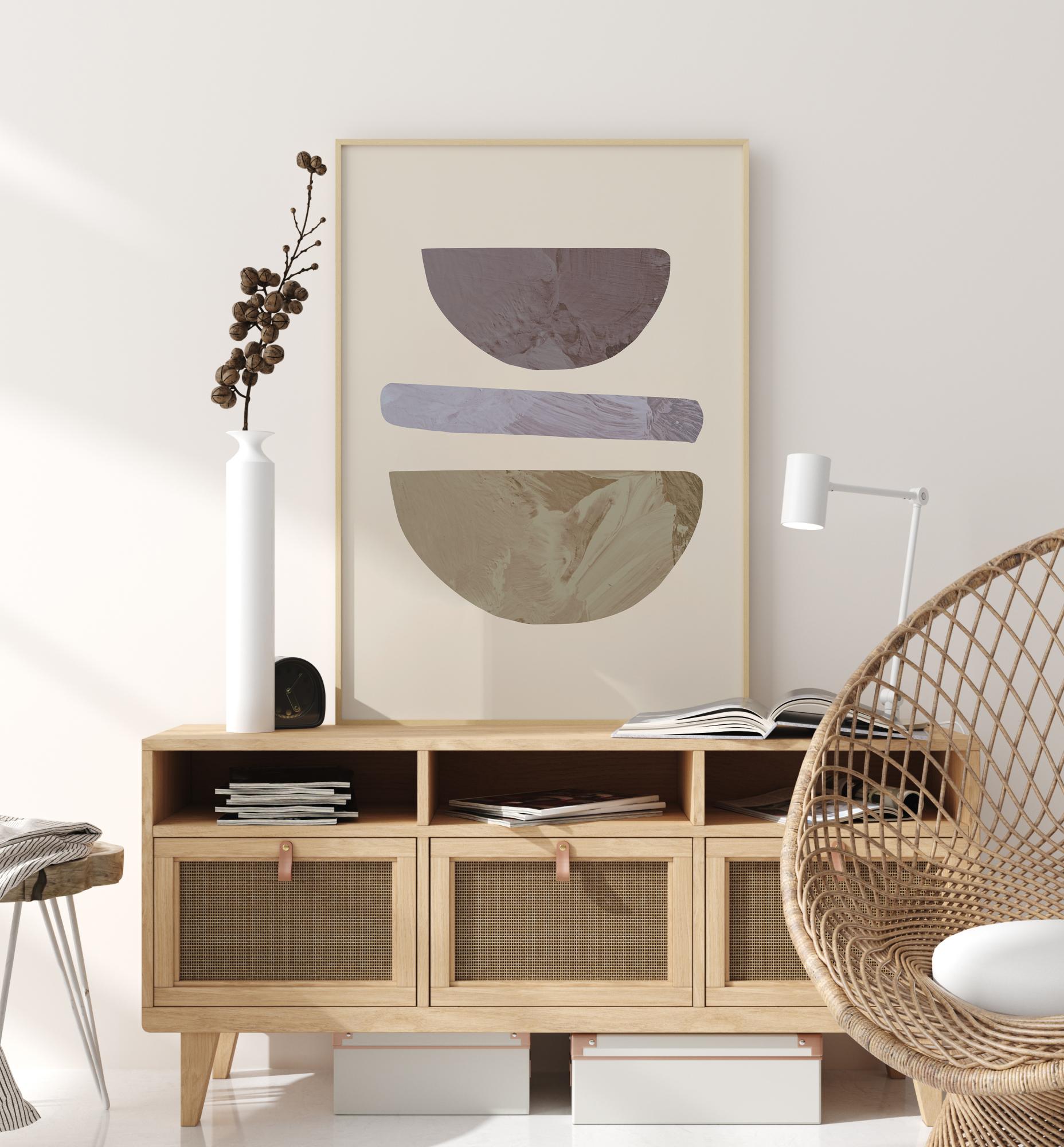 Un poster abstract cu trei forme distincte de diferite dungi colorate. O mare semicerc de culoare crem și bej este plasat în marginea inferioară și o dungă subțire albastră deasupra acesteia. În partea superioară se află un al doilea semicerc în gri și albastru. Când agăți această lucrare în holul casei tale, devine un subiect de conversație garantat.