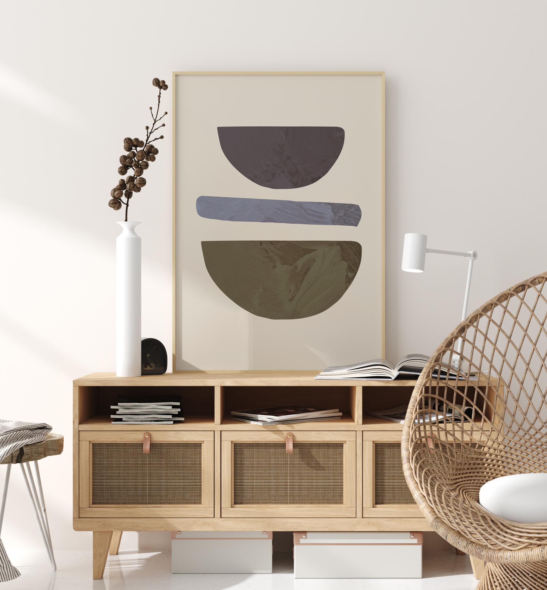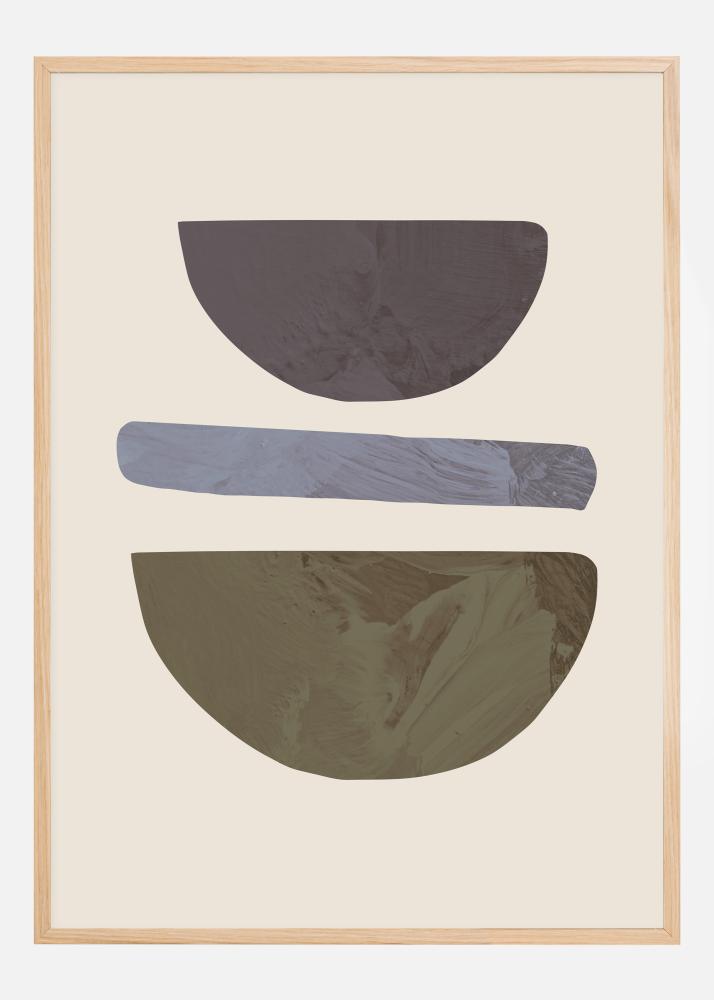 Un poster abstract cu trei forme și culori diferite. Un semicerc maro este plasat în partea de jos cu o linie albastru deschis în mijlocul imaginii. Deasupra se află un semicerc gri închis. Totul pe un fundal alb. Agață această lucrare pe un perete neted pentru cel mai bun efect.