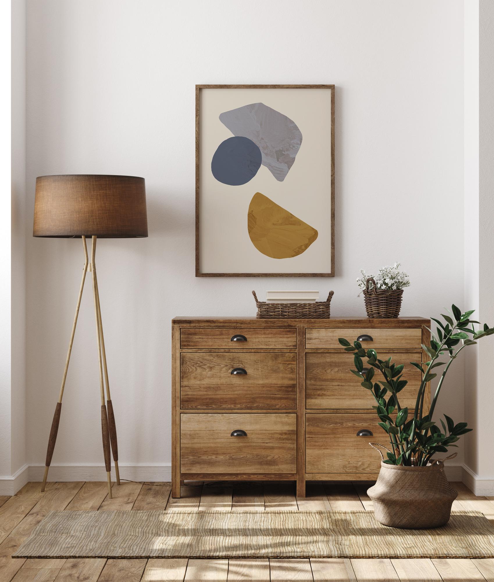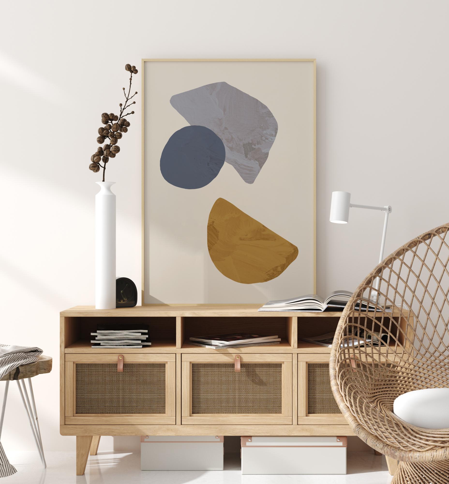 Un poster abstract cu trei forme și culori diferite. Un semicerc maro este plasat în partea de jos, cu o linie albastră deschisă în mijlocul imaginii. Deasupra se află un semicerc gri închis. Totul pe un fundal alb. Agăță această lucrare pe un perete neted pentru cel mai bun efect.