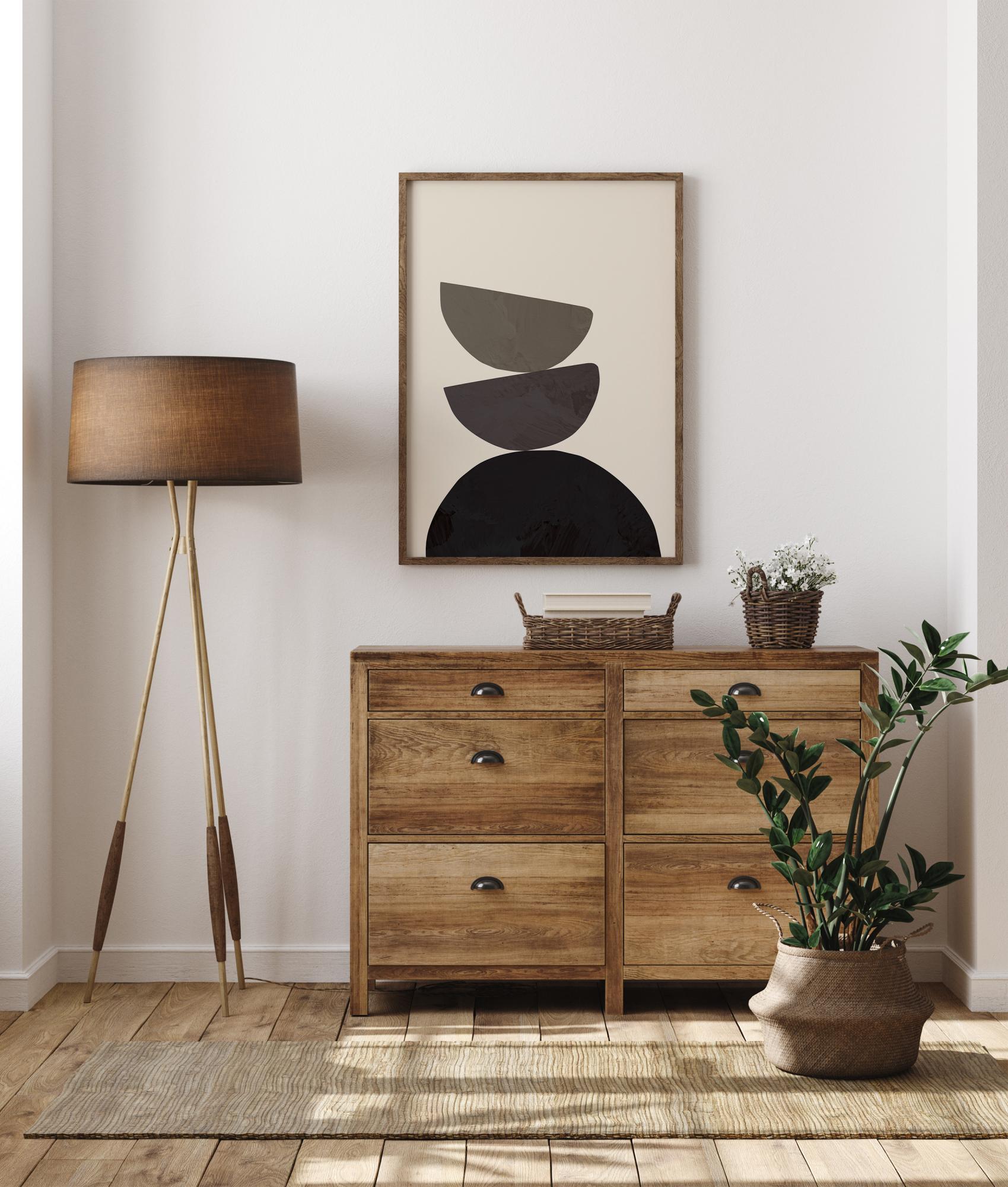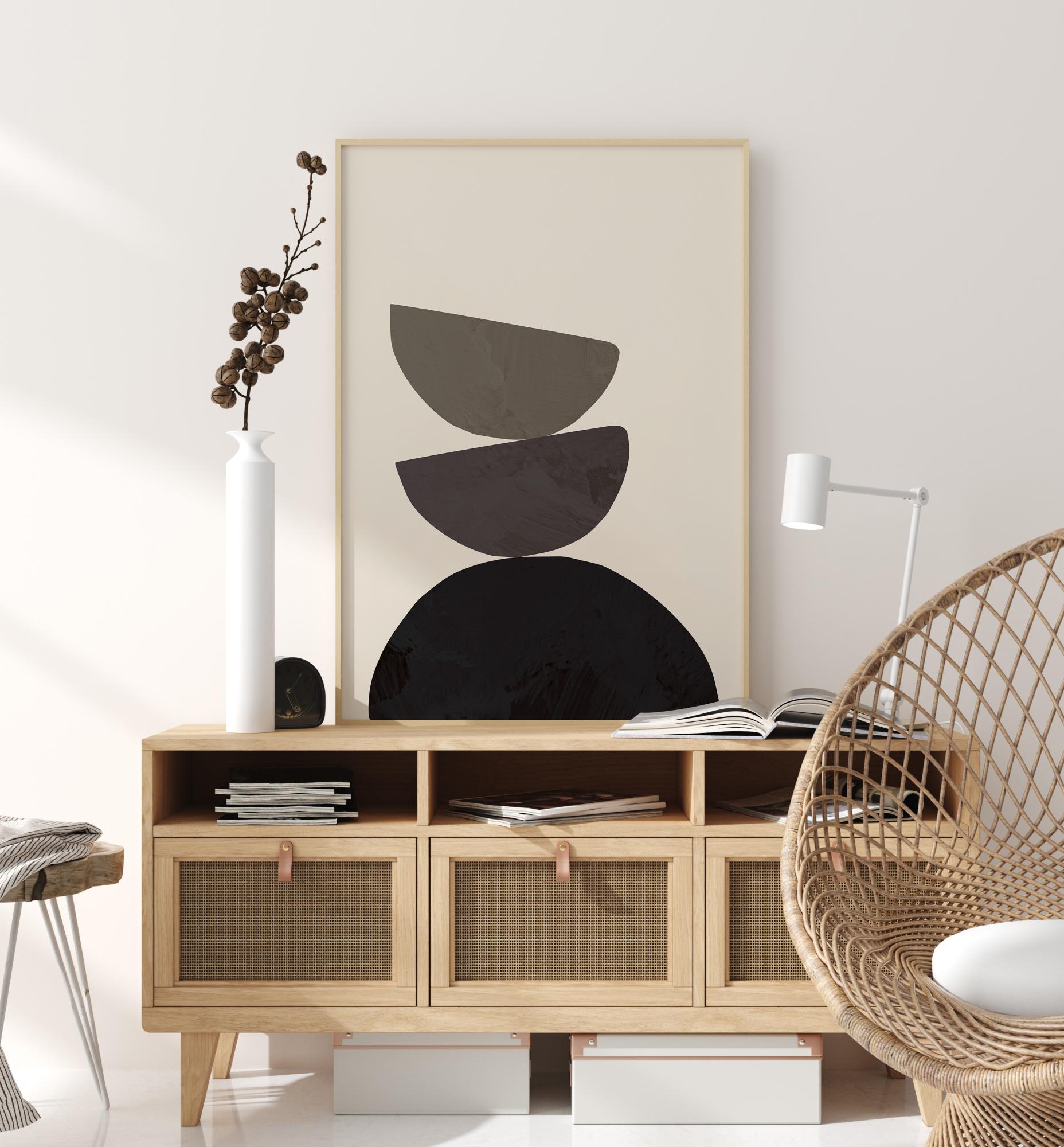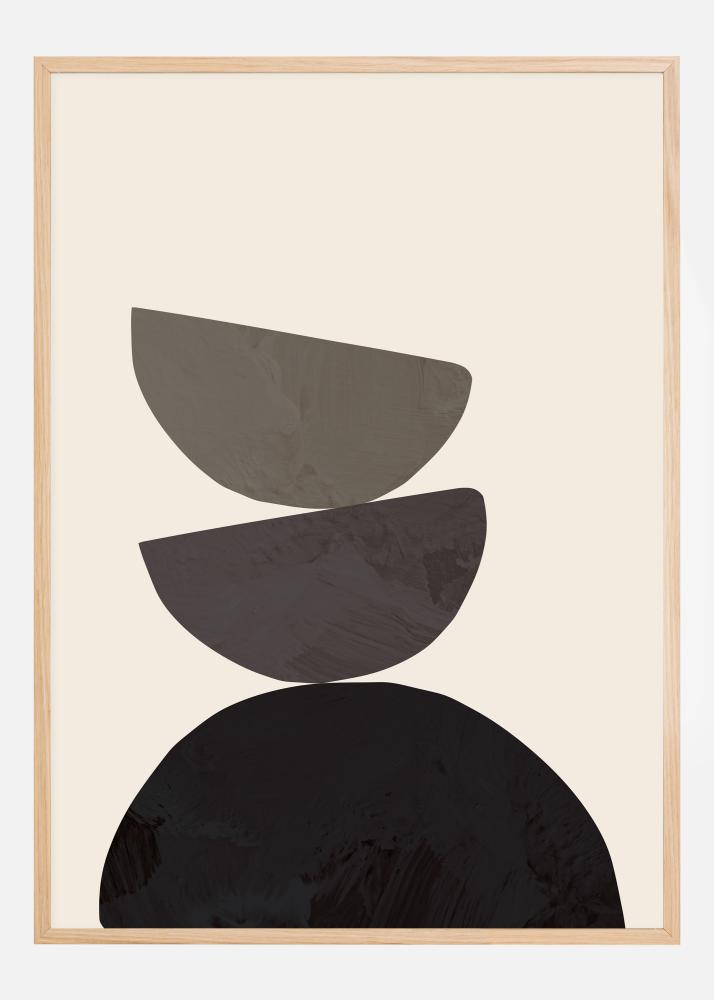 Un poster cu trei semicercuri stivuite care se echilibrează între ele. La bază este un semicerc negru cu două semicercuri întoarse în sus în diferite nuanțe de gri. Bucurați-vă de formele incredibil de echilibrate când agățați această imagine pe un perete în culori deschise.