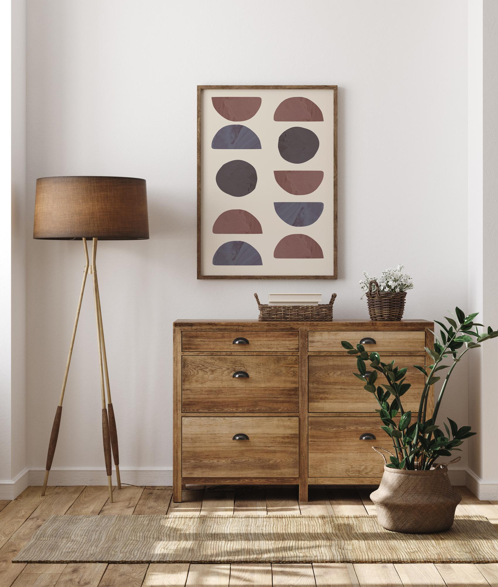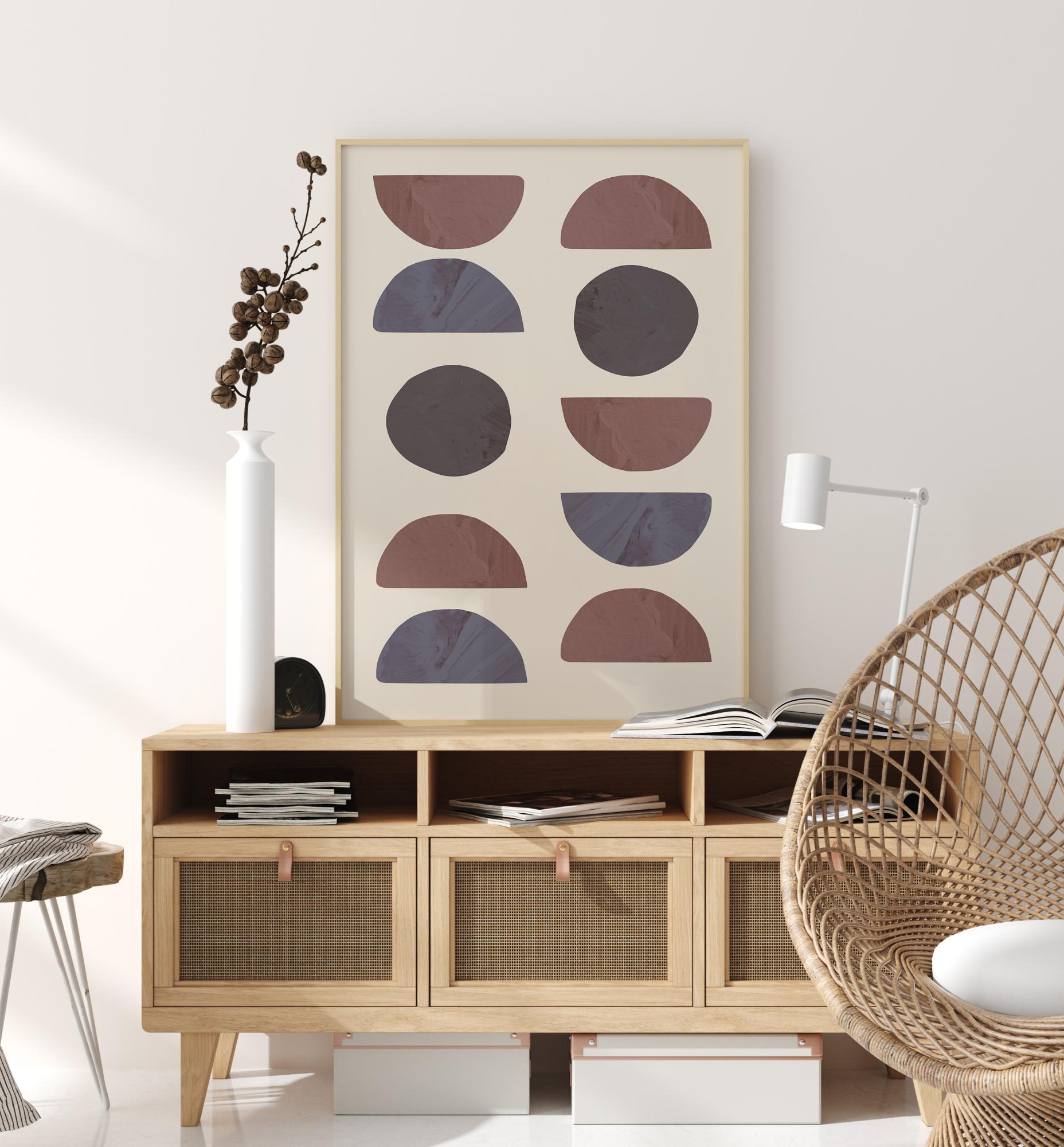Un poster abstract plin cu diverse semicercuri și forme circulare. Există două rânduri cu forme care au diferite modele de cercuri și semicercuri, toate în nuanțe diferite de albastru, gri și roșu. Înveselește un perete simplu din casă cu aceste forme geometrice.