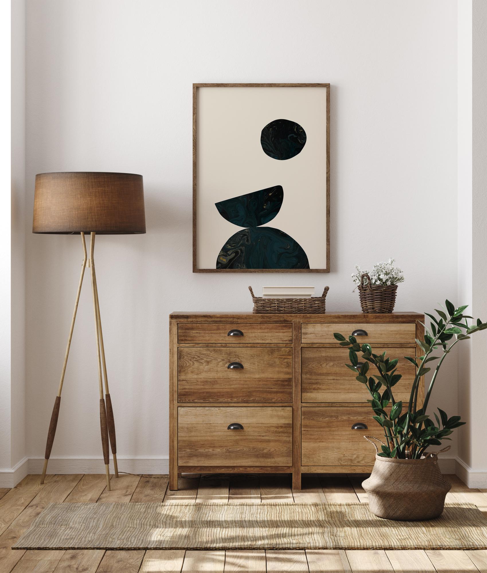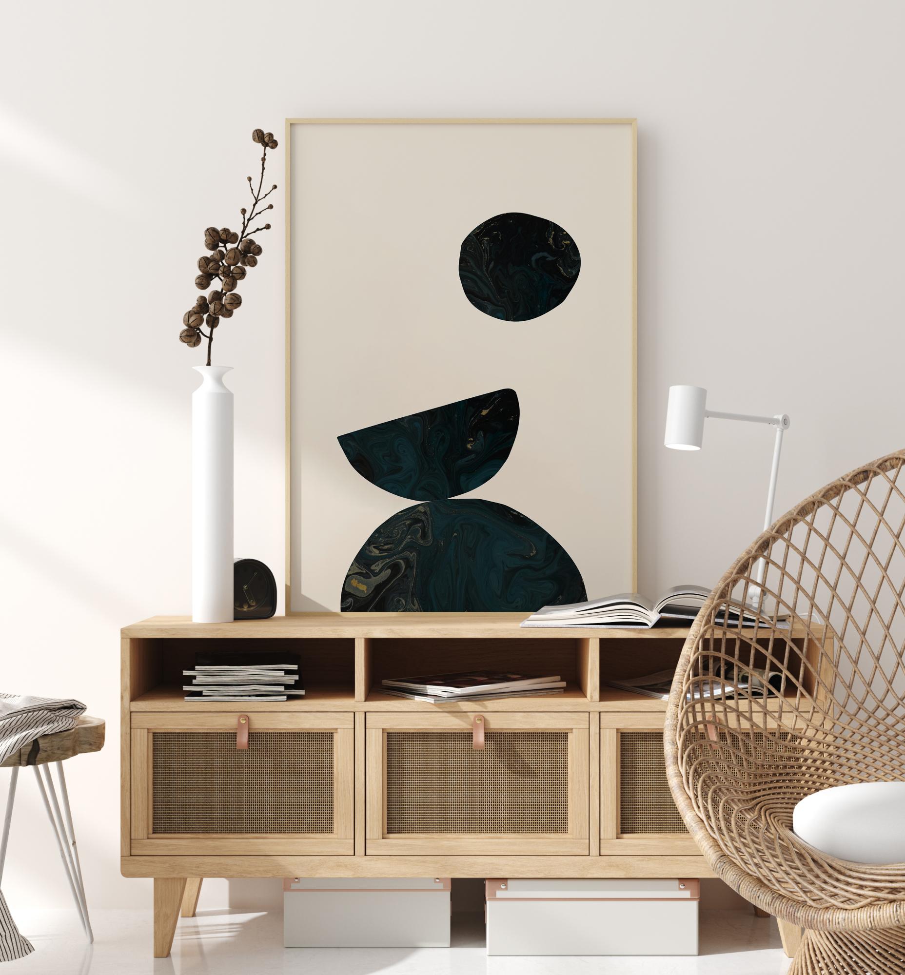 Un poster luminos cu trei forme de un albastru închis și negre care creează o imagine izbitoare. Un semicerc este plasat în partea de jos și echilibrează un alt semicerc cu susul în jos. Deasupra plutește un cerc negru. Totul este pe un fundal alb contrastant. Potrivește vârtejurile marmoreene frumoase cu o nuanță mai palidă pe pereți pentru un plus de dramă.