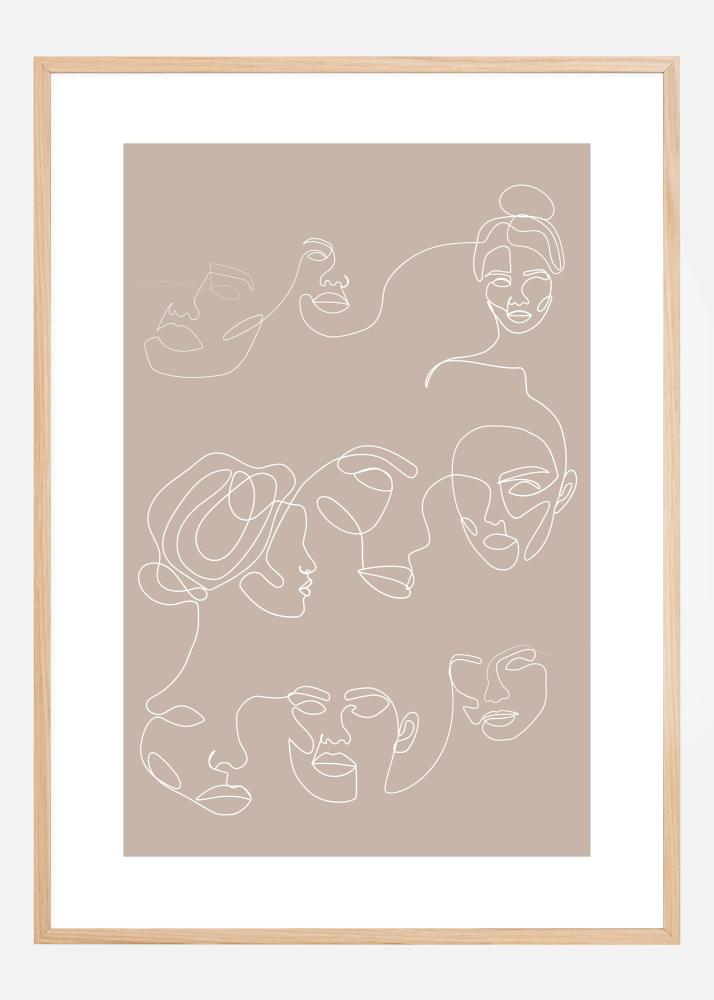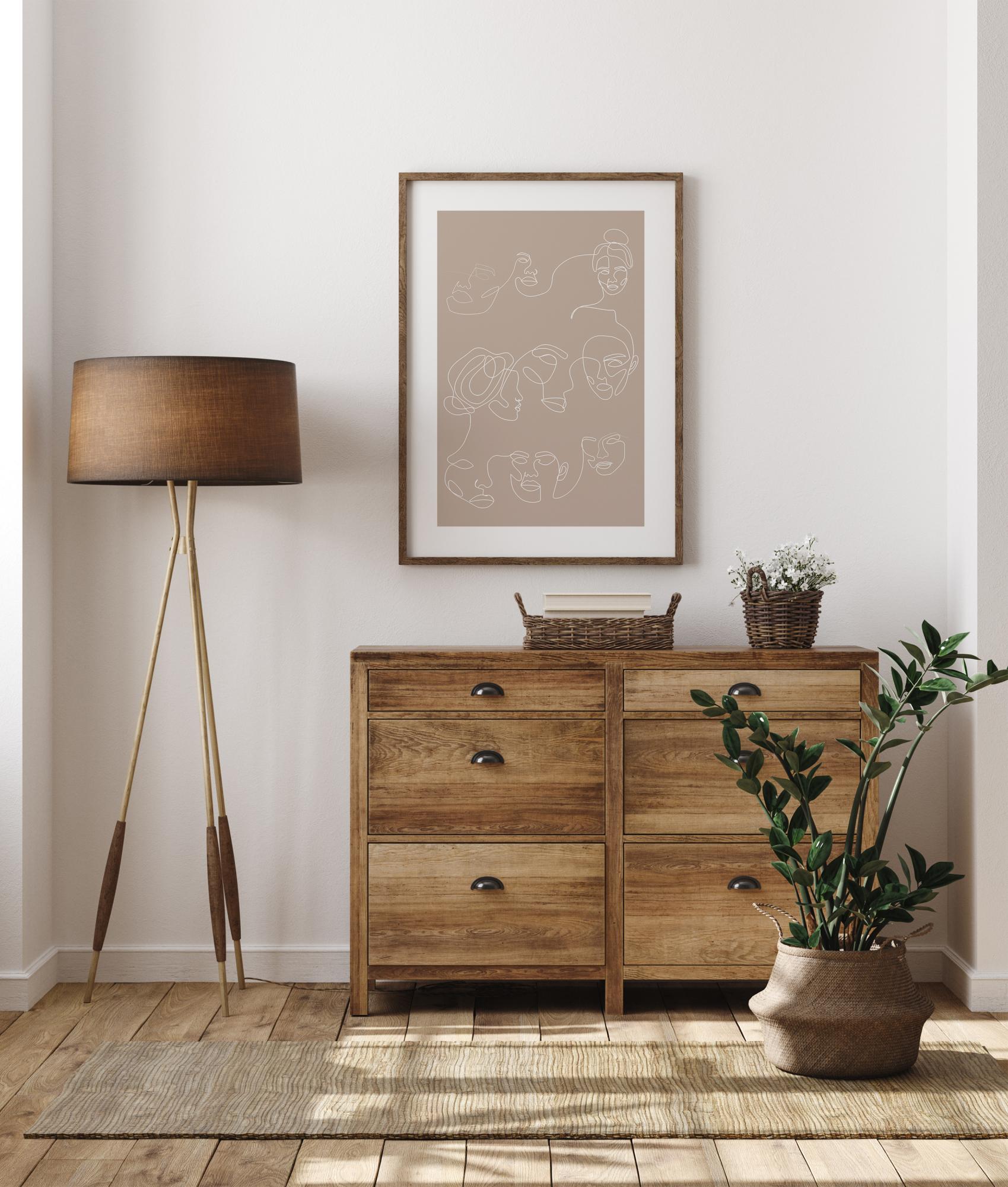 Un poster cu schițe având un număr de capete și fețe abstracte desenate diferit. Aceste capete abstracte au fost desenate toate cu o singură linie și sunt unite într-un rând lung. Liniile albe de pe fundalul bej ar funcționa bine împreună cu un perete colorat îndrăzneț pentru o atmosferă artistică suplimentară.