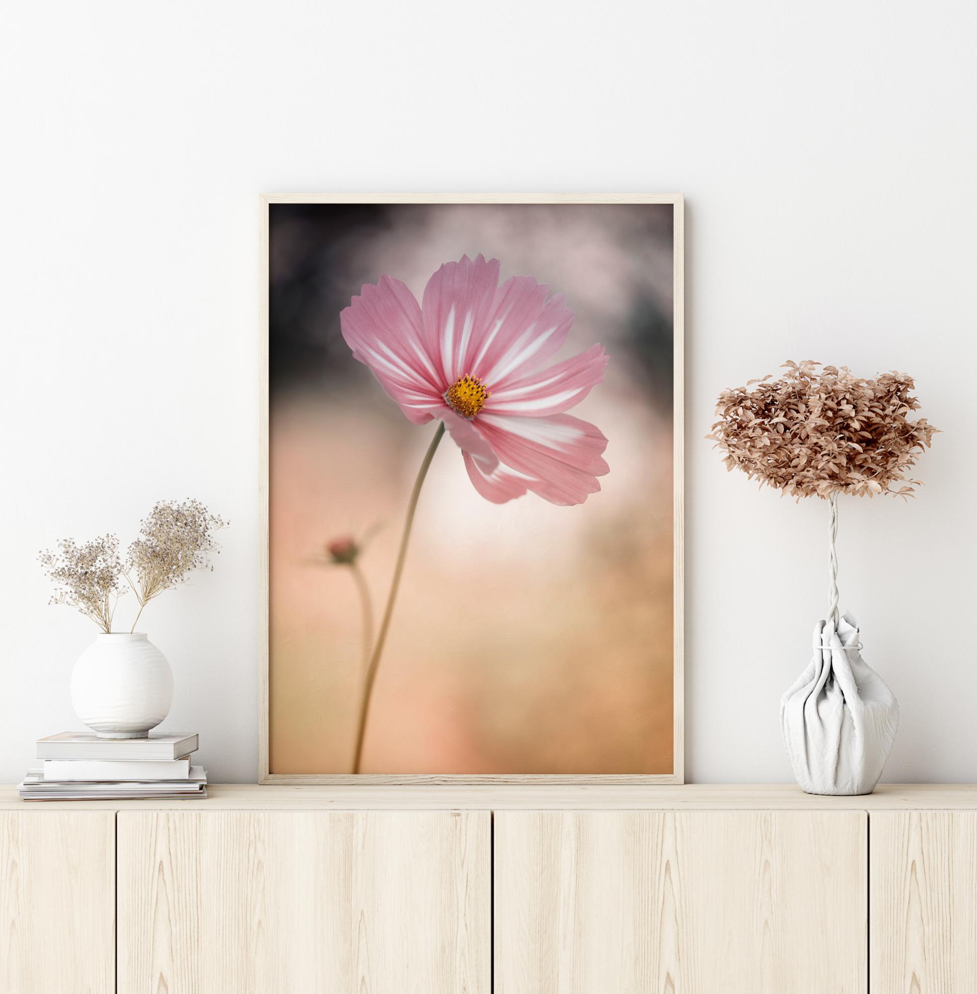 Un poster fantastic cu o cosmos cu lumina care strălucește prin petală. Rozul petalei și mijlocul galben sunt luminoase cu un fundal de culoarea piersicii care oferă adâncime. Simte lumina și adierea când privești această imagine pastelată moale atârnând în casa ta.