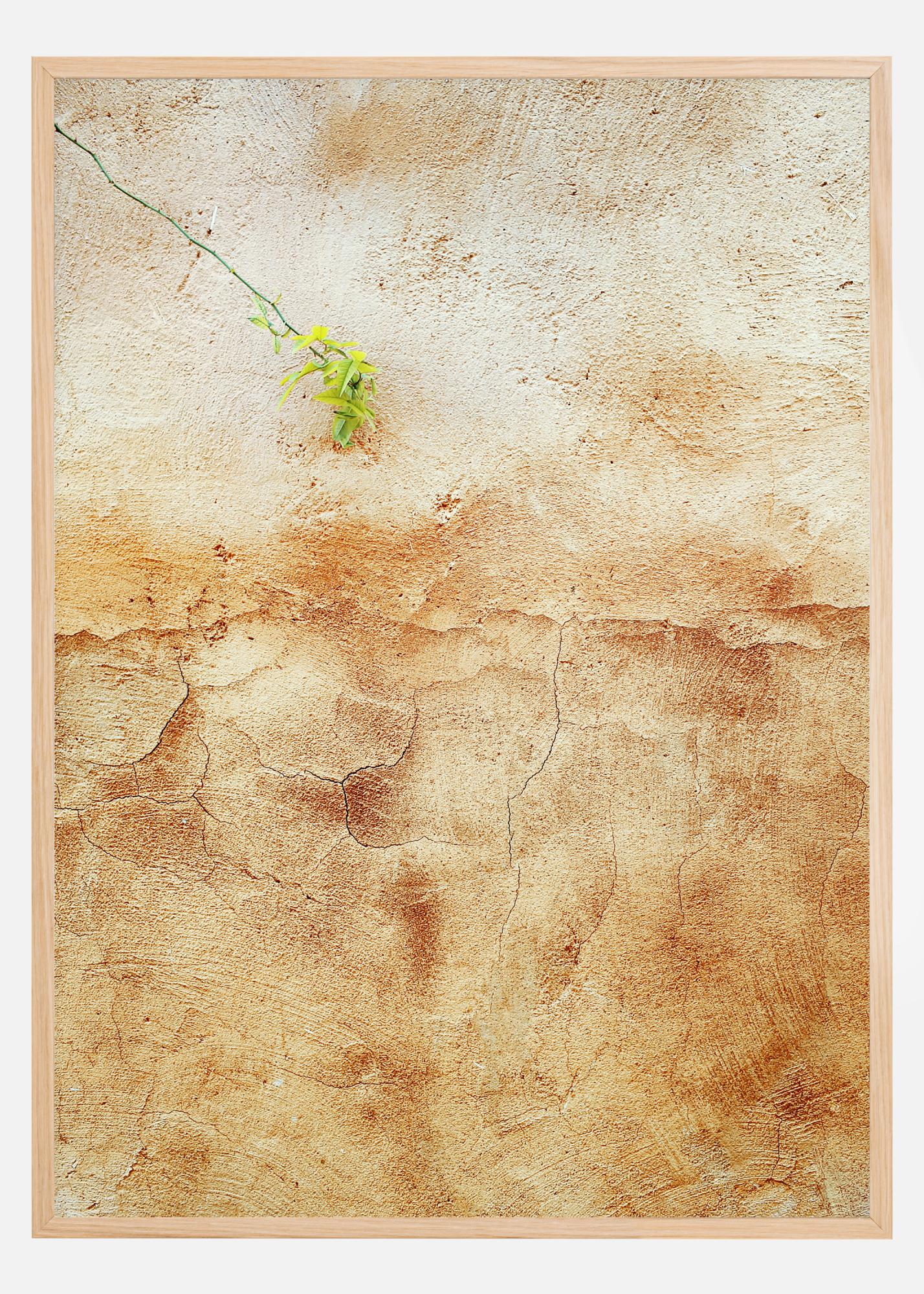 Un poster de prim-plan cu un perete crăpat cu o mică plantă verde deschis care crește în crăpătură. Peretele moale de culoare maronie este compensat de crăpătura subțire verde și de planta luminoasă. Lasă-ți privirea să rătăcească până găsește toate crăpăturile ciudate de pe această suprafață texturată. Potrivește această operă cu un perete de culoare similară pentru cel mai bun efect.