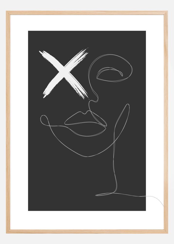 Un poster abstract cu un chip desenat cu linii subțiri albe pe un fundal negru. Liniile albe sunt toate unite pentru a crea chipul într-o mișcare fluidă. Acolo unde ar trebui să fie un ochi, se află o cruce albă dramatică. Ce înseamnă asta? Agață această lucrare central pentru o conversație artistică acasă.