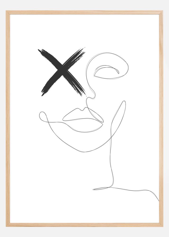 Un poster abstract cu un chip desenat cu o linie subțire neagră pe un fundal alb. Linia este unită într-o mișcare fluidă pentru a desena chipul. Deasupra unui ochi este desenată o cruce mare neagră. Agață-l pe un perete colorat pentru a obține un subiect de conversație interesant.