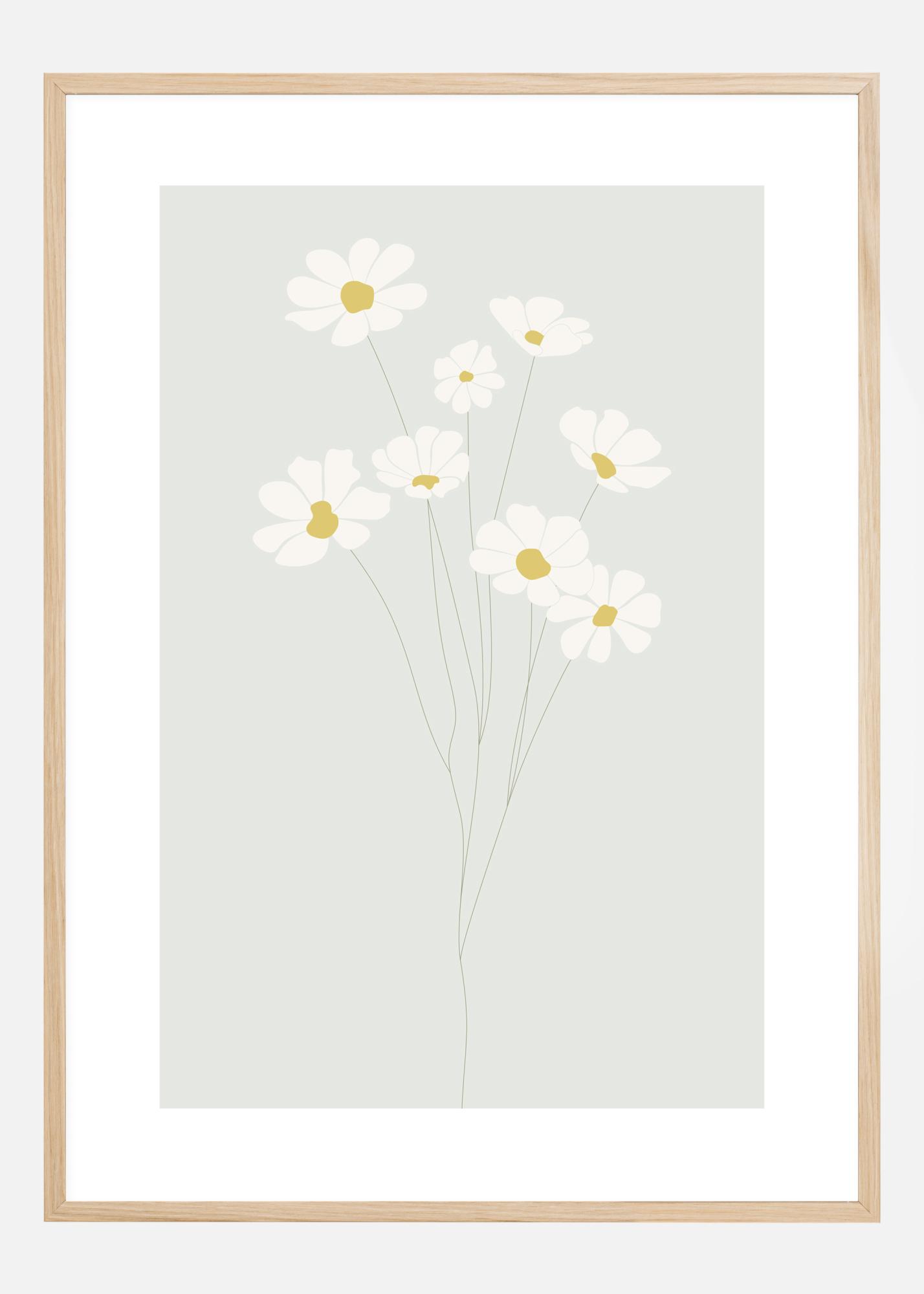 Un poster subtil cu o imprimare a unei margarete cu un aspect delicat. Florile simple albe și galbene se întind pe tulpini subțiri pe un fundal albastru pal moale. Agață această imagine în dormitorul copilului tău pentru o atmosferă liniștită, dar drăguță.