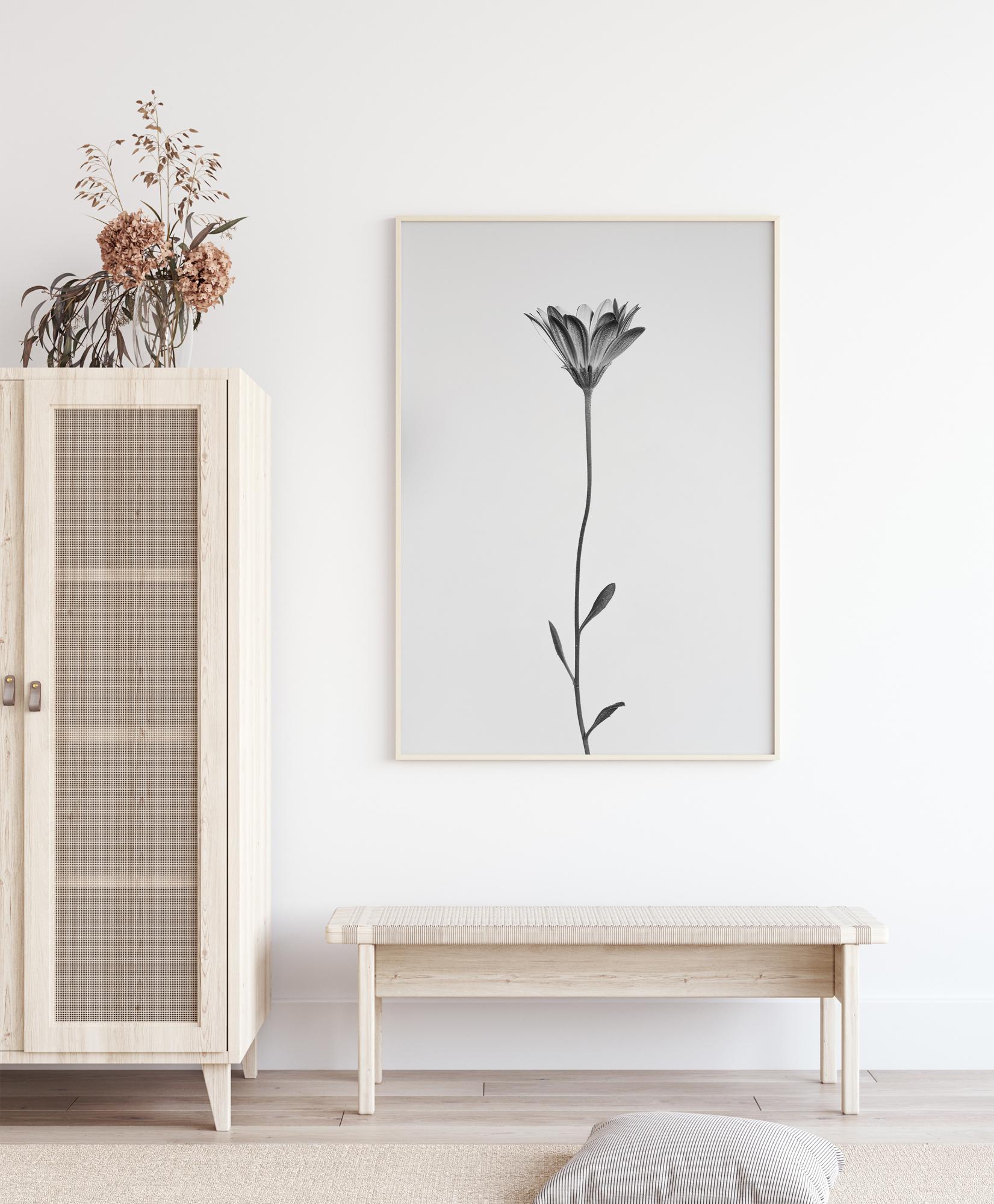 Un poster cu o prim-plan a unui margaretă lungă pe un fundal alb curat. Eleganța simplă a florii este un plus perfect pentru baia sau bucătăria ta minimalistă.