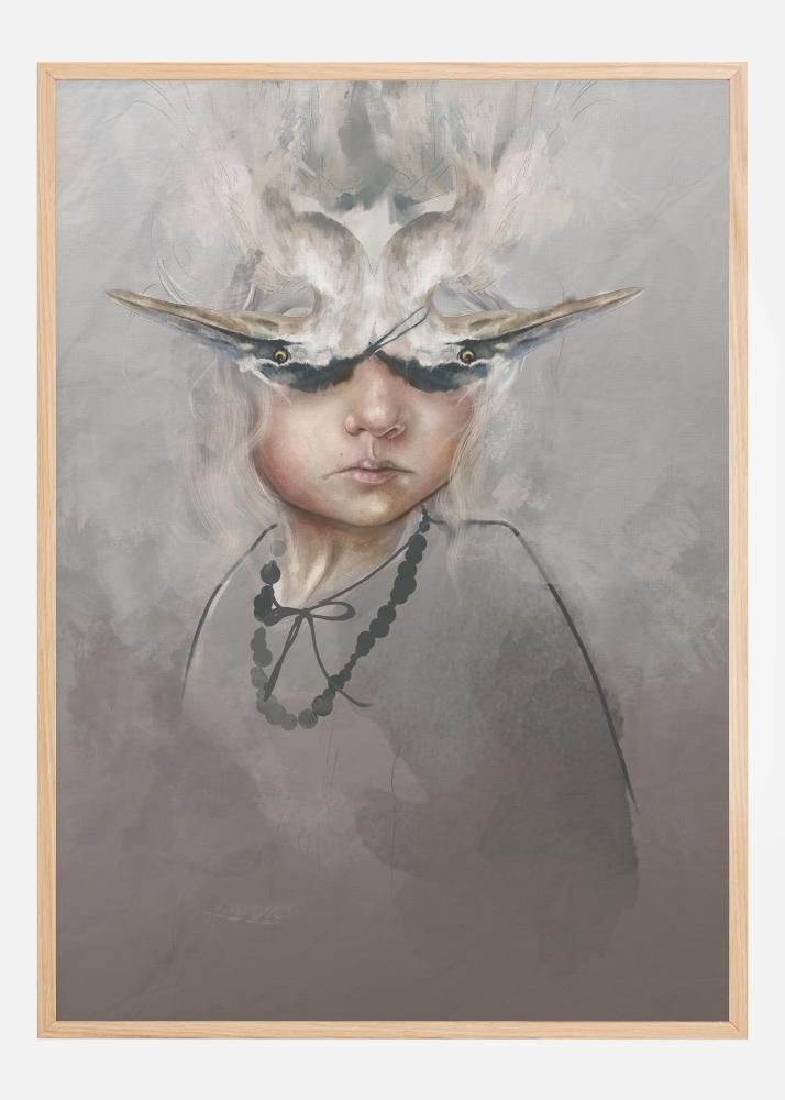 Un poster înfiorător cu o persoană învăluită în fum. Capul este acoperit de o pălărie, care pare să fie în flăcări și arată ca două păsări întoarse sau un craniu. Ochii sunt umbriți misterios, iar persoana emană o calmă misterios. Agățați această lucrare în casa dvs. și permiteți interpretări suplimentare.