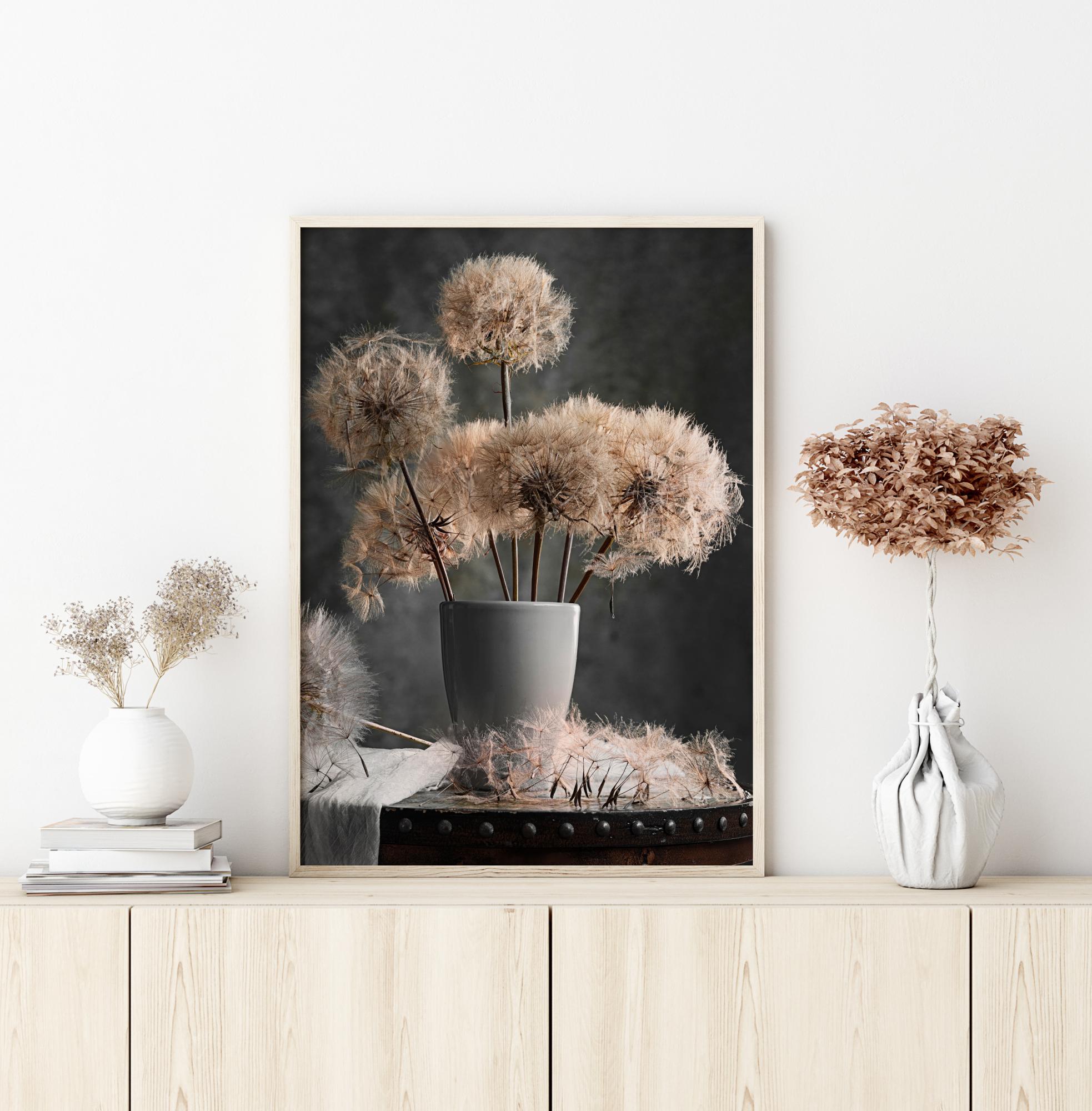 Un poster stilizat cu păpădie ofilită într-o vază pe un fundal gri închis. Pendulii de păpădie au început să-și împrăștie semințele care plutesc în jurul capetelor florilor. Imaginează-ți trecerea timpului în timp ce privești aceste păpădii ofilite.